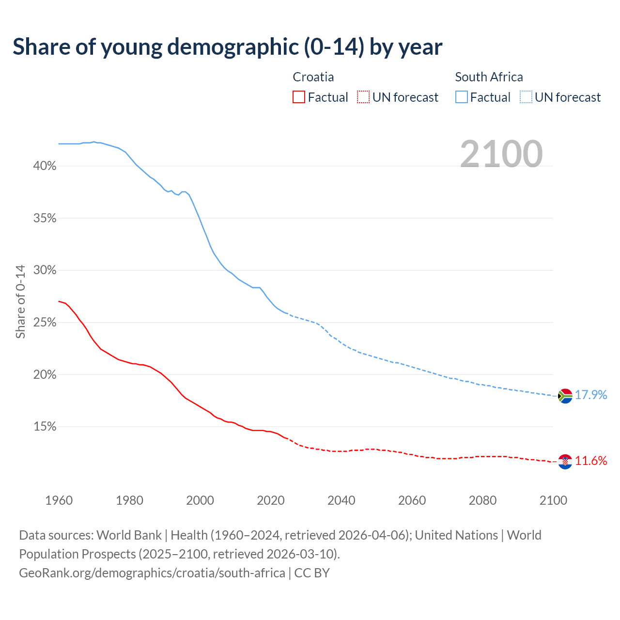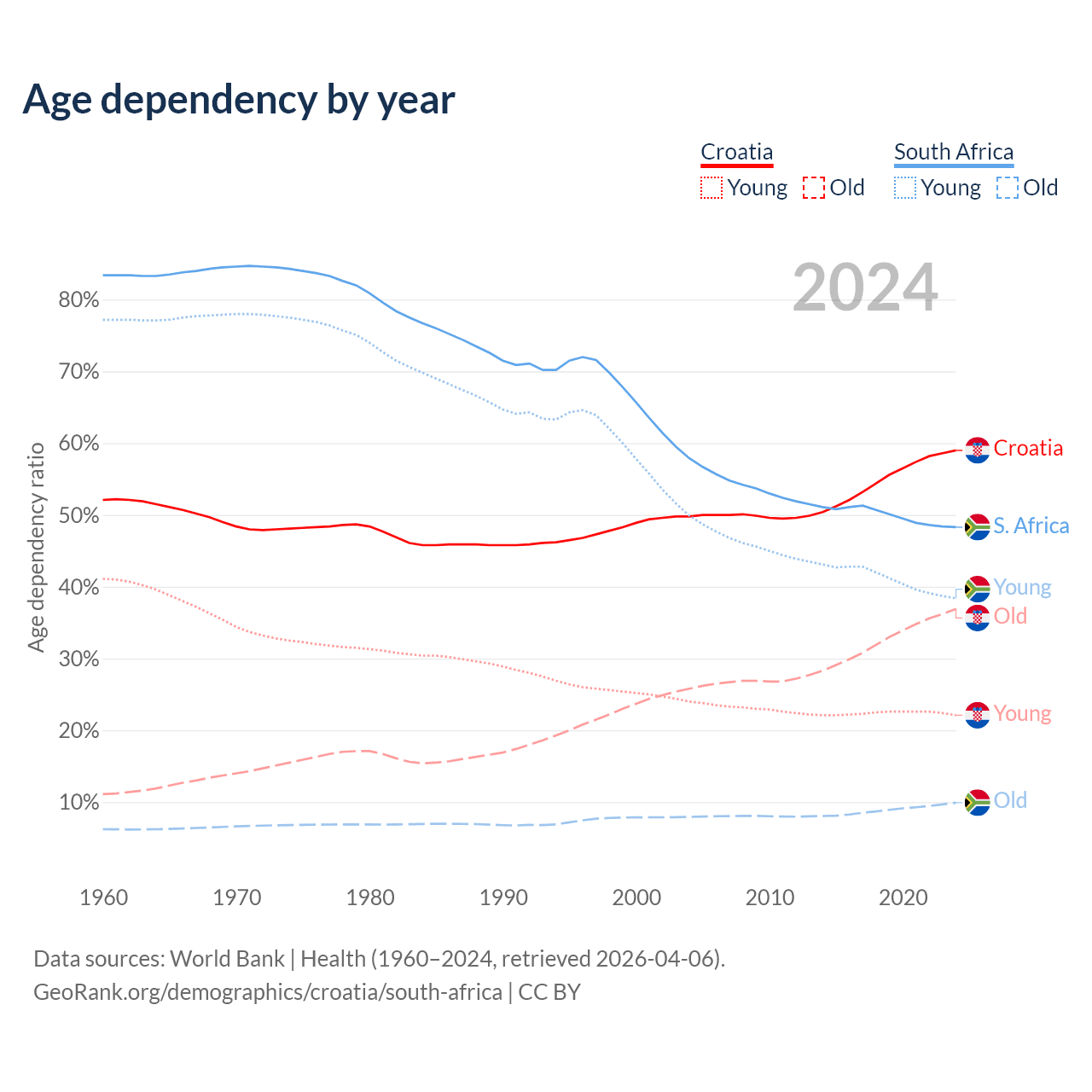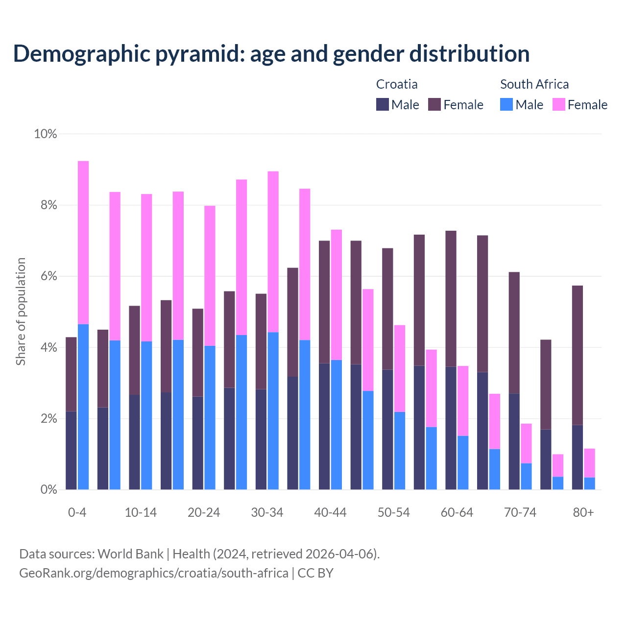 - Croatia is ranked 11/196 by median age (oldest to youngest) vs 107/196 for South Africa.