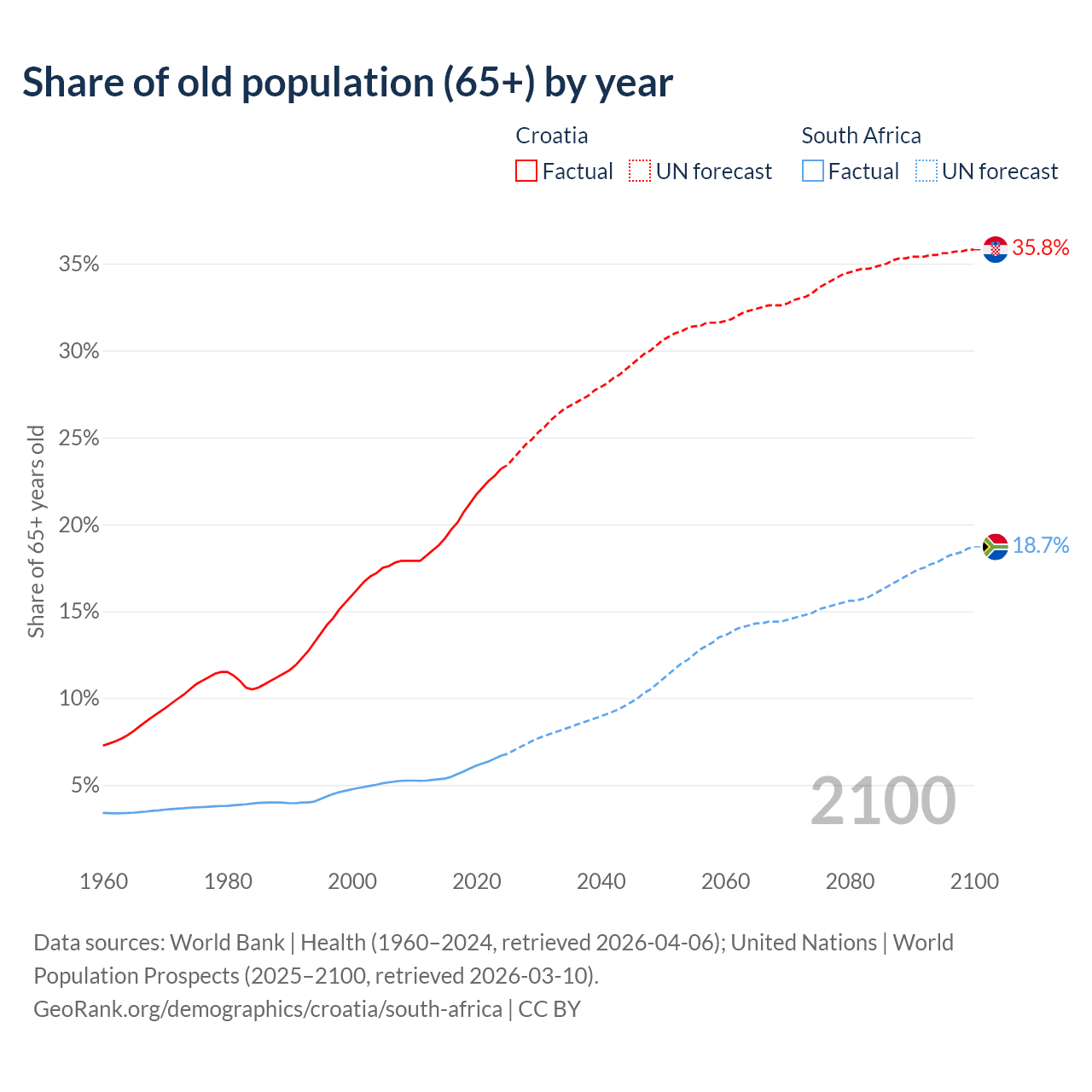 The share of older people aged 65 and over is 23.2% in Croatia and 6.69% in South Africa. Life expectancy in Croatia compared to South Africa .