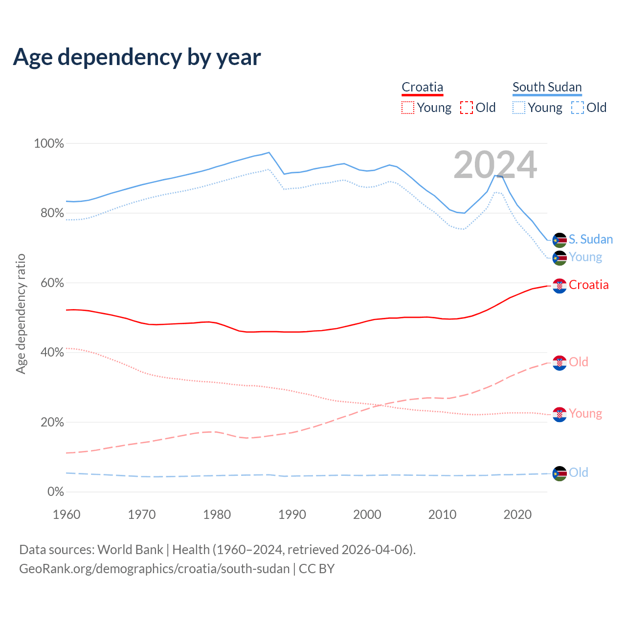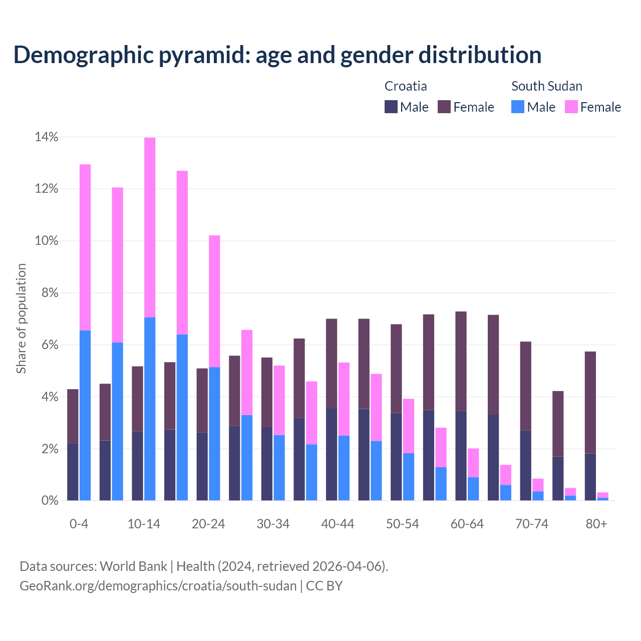 - Croatia is ranked 11/196 by median age (oldest to youngest) vs 173/196 for South Sudan.