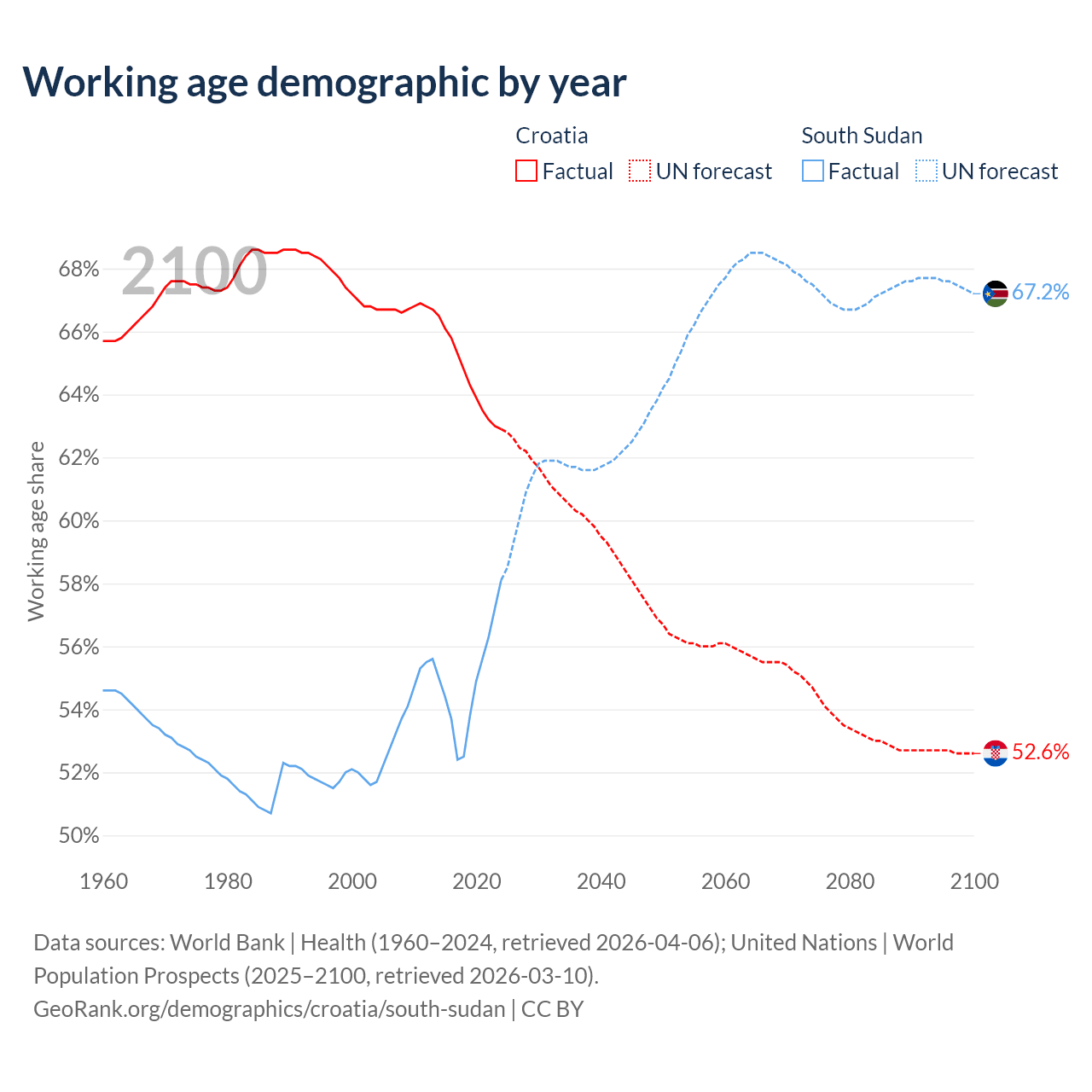 - Croatia has 2.4M working age adults (aged 15-64) vs 7.27M in South Sudan.