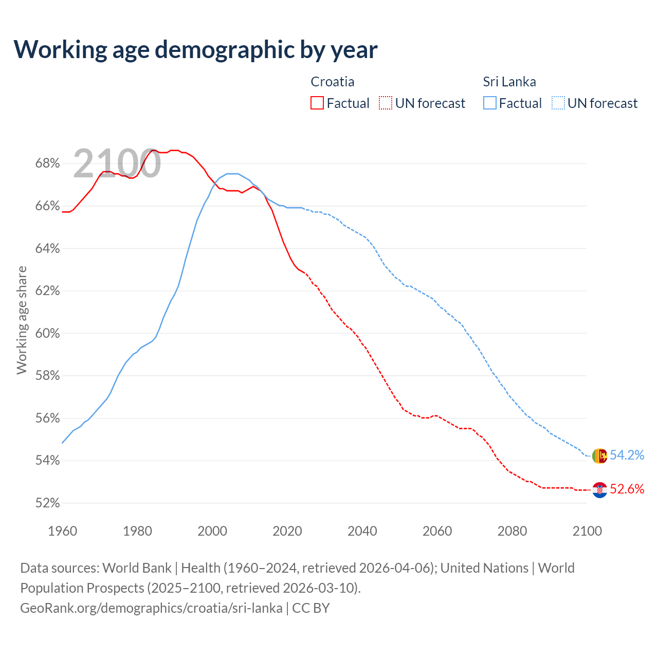 Median age Croatia vs Sri Lanka, 1960-2100