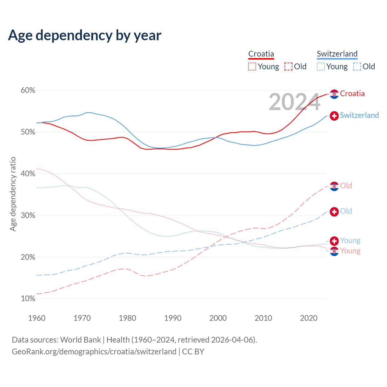 - Croatia is ranked 11/196 by median age (oldest to youngest) vs 24/196 for Switzerland.
