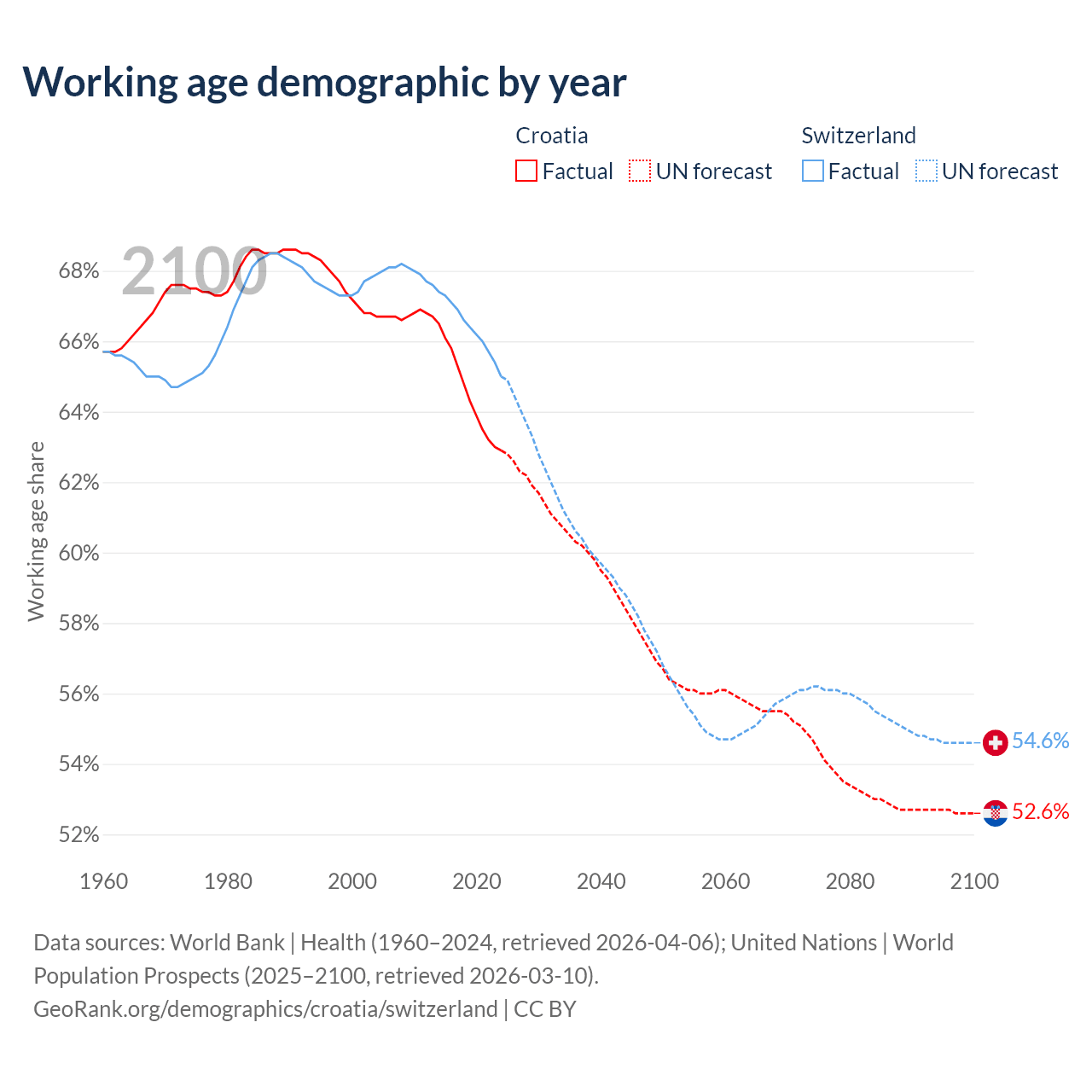 Median age Croatia vs Switzerland, 1960-2100