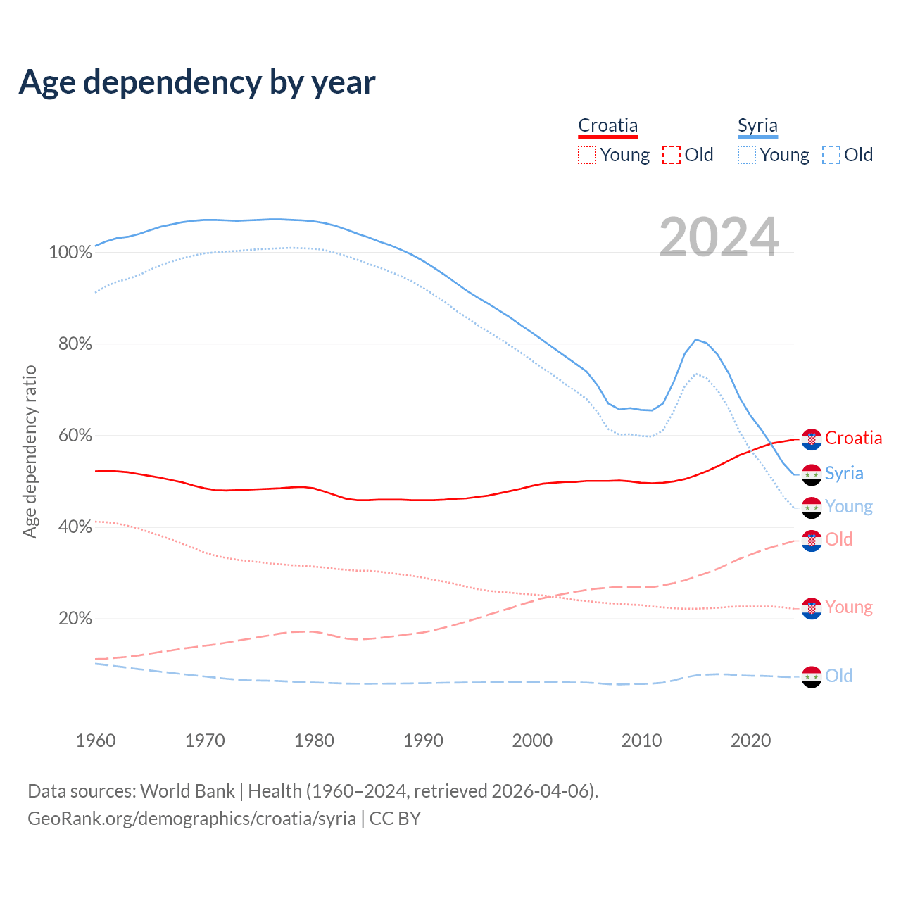 The share of older people aged 65 and over is 23.2% in Croatia and 4.74% in Syria. Life expectancy in Croatia compared to Syria .