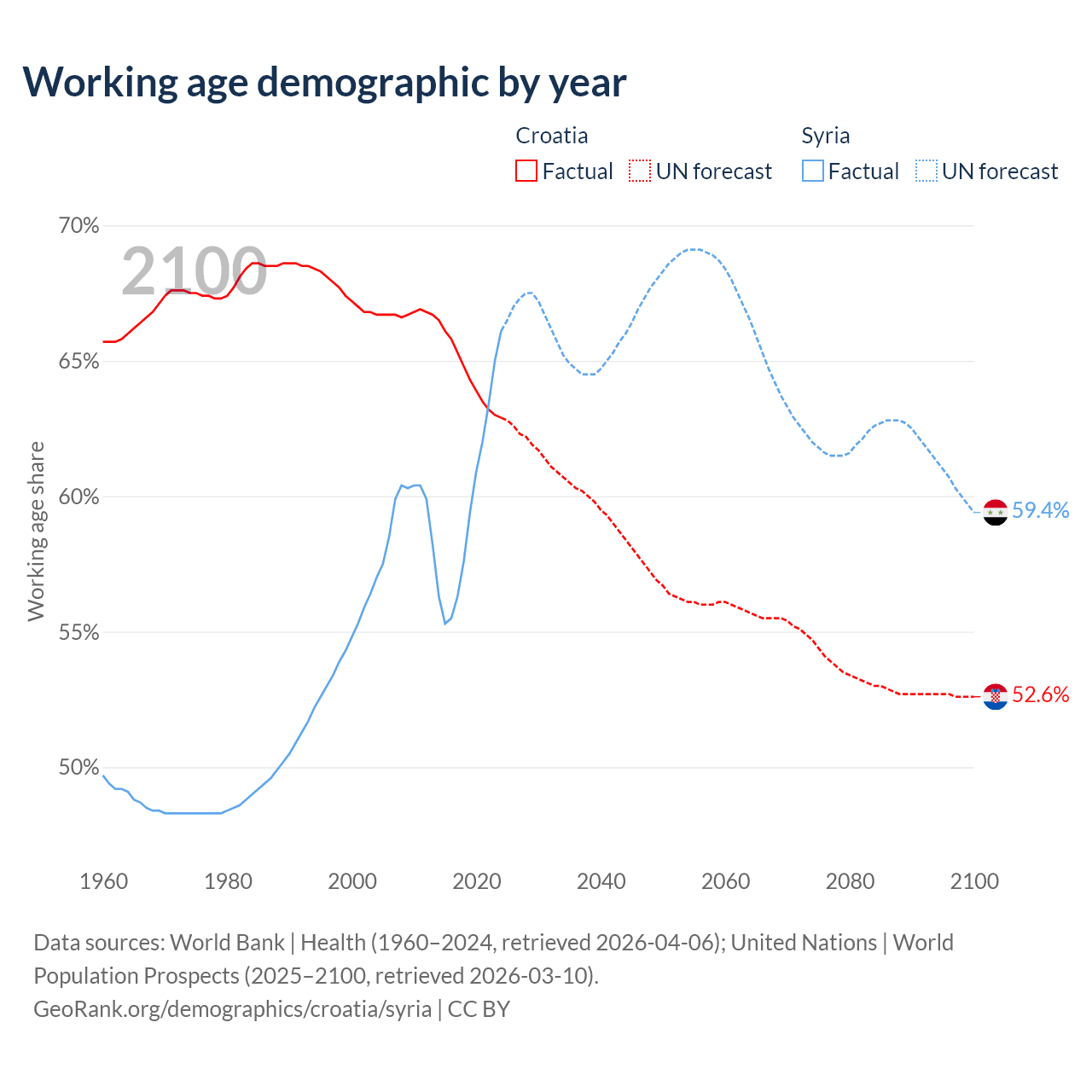 Median age Croatia vs Syria, 1960-2100