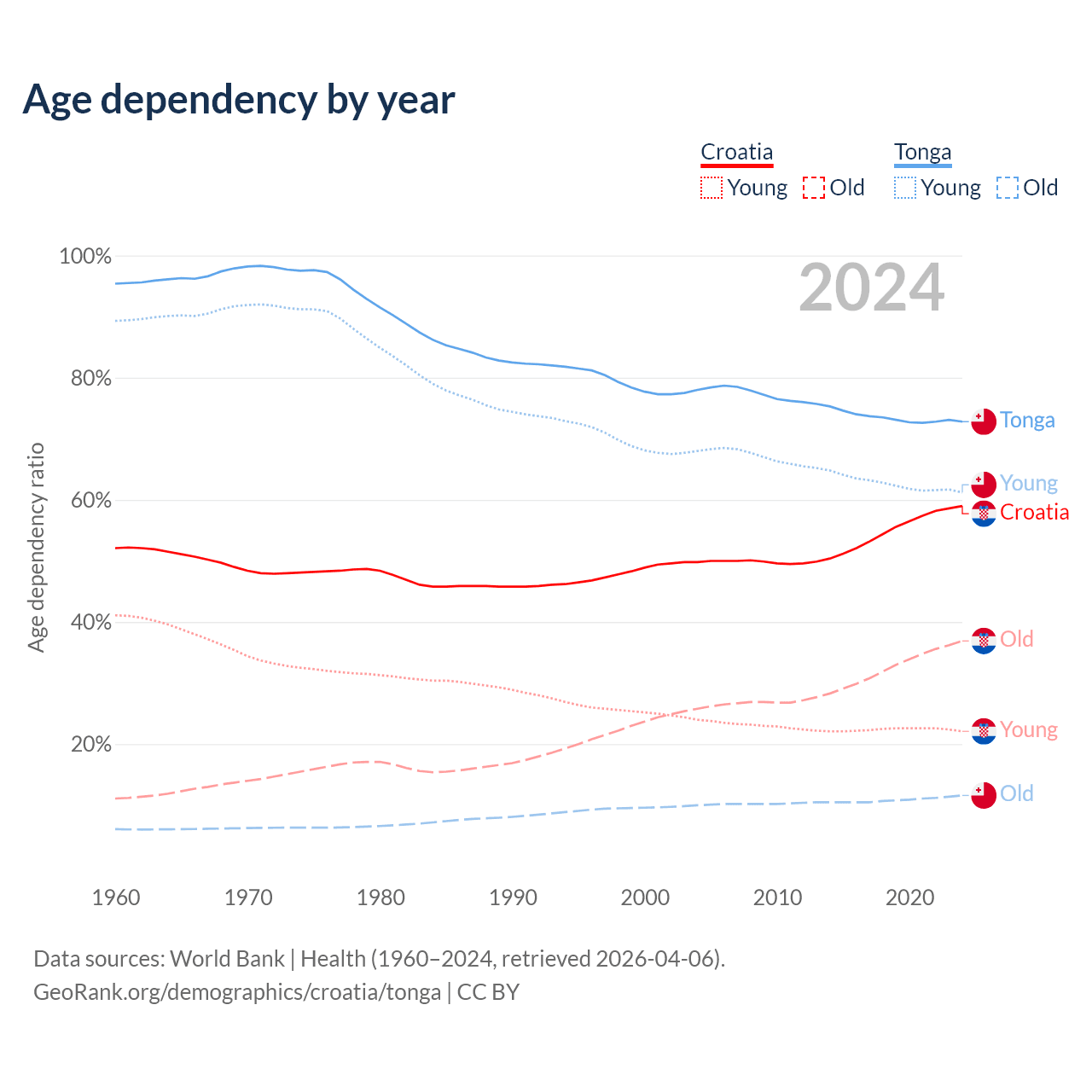 - The share of old-age demographic (65+) in Croatia is 23.2% vs 6.72% in Tonga.