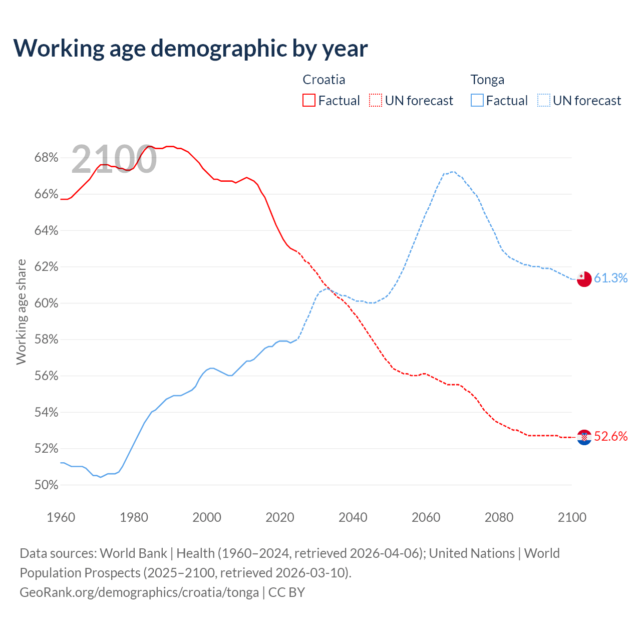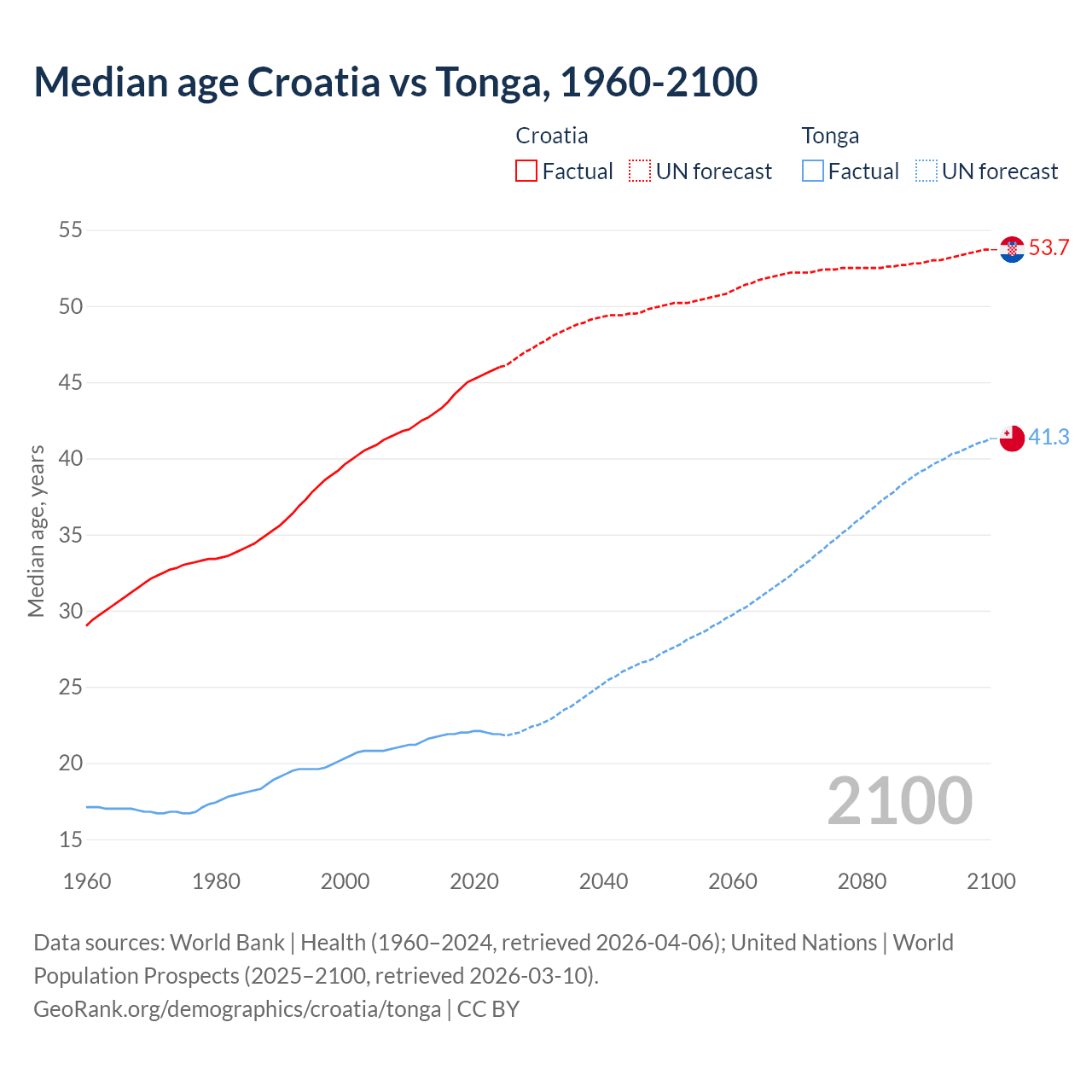 Median age Croatia vs Tonga, 1960-2100