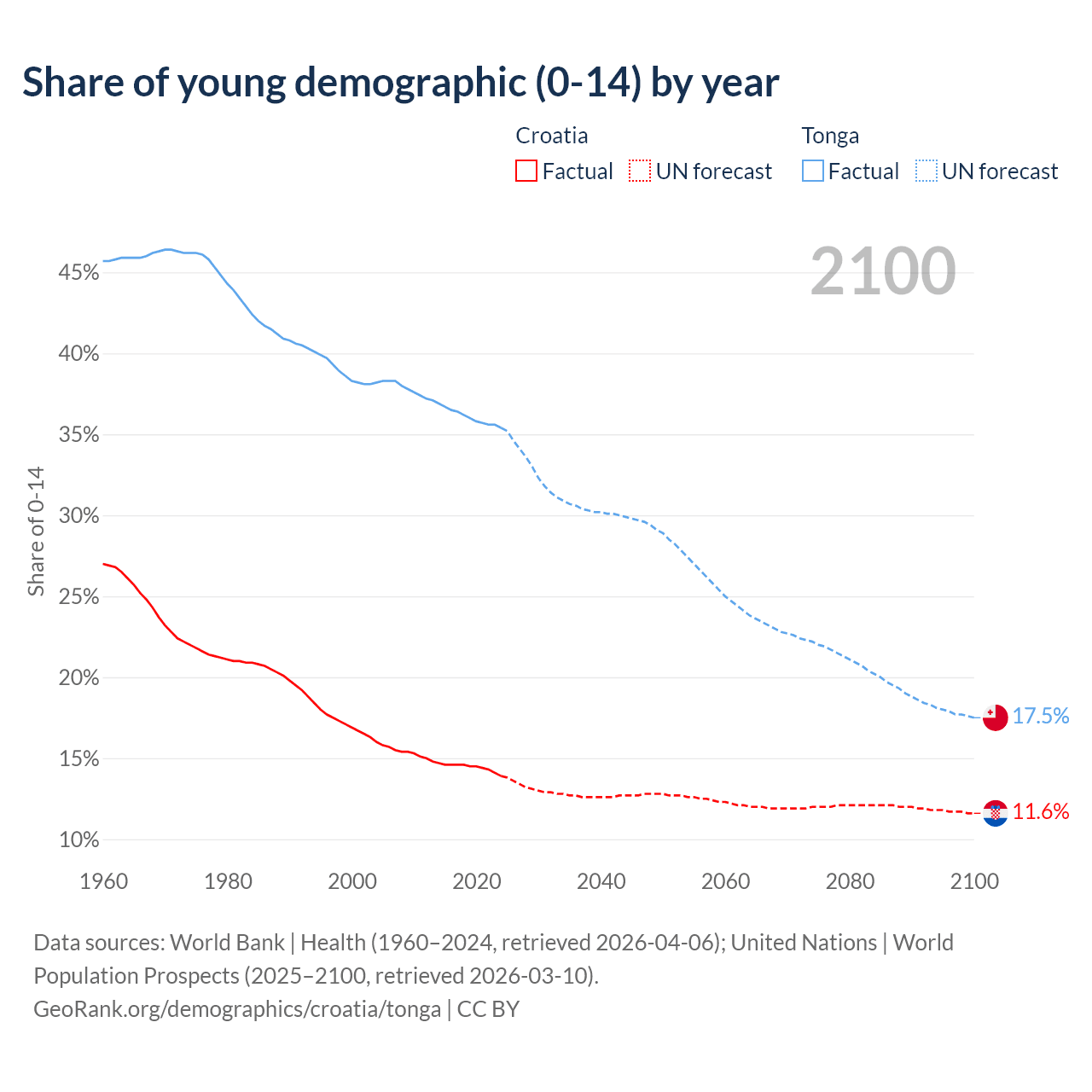 - The share of young demographic (0-15 years old) in Croatia is 13.9% vs 35.4% in Tonga.