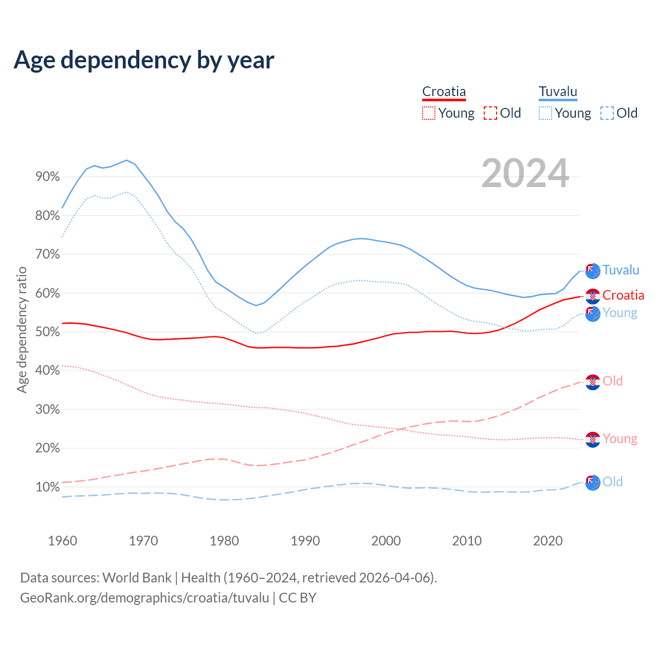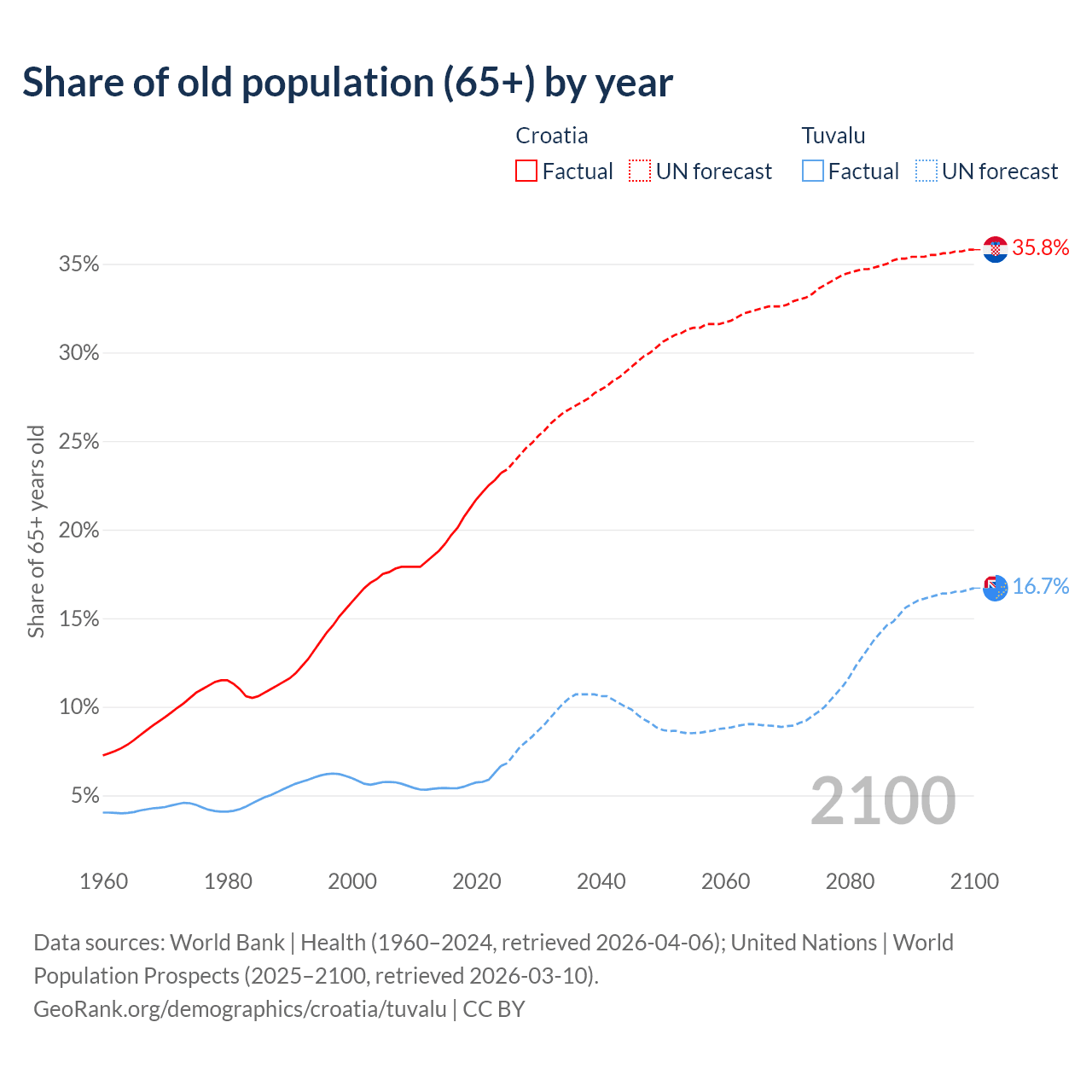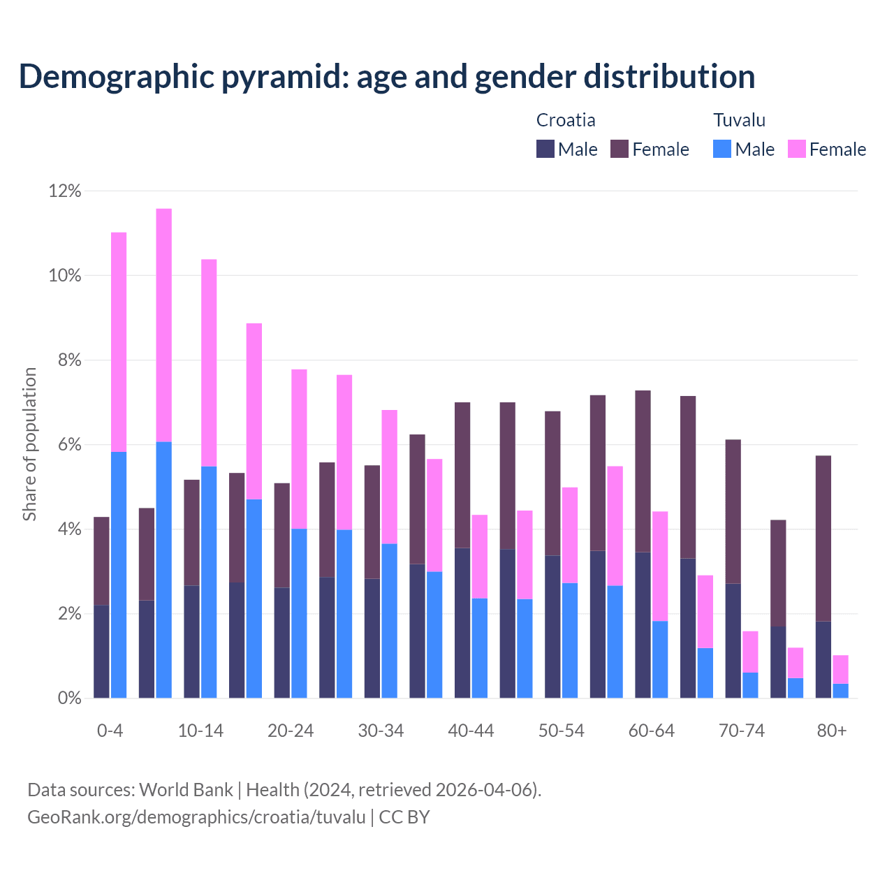 - The share of old-age demographic (65+) in Croatia is 23.2% vs 6.67% in Tuvalu.