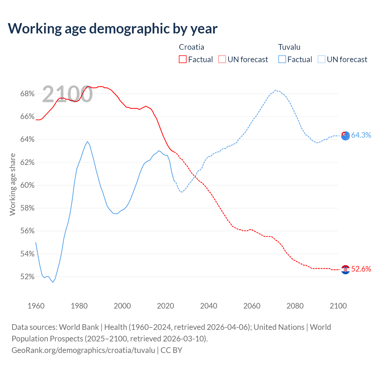 Median age Croatia vs Tuvalu, 1960-2100