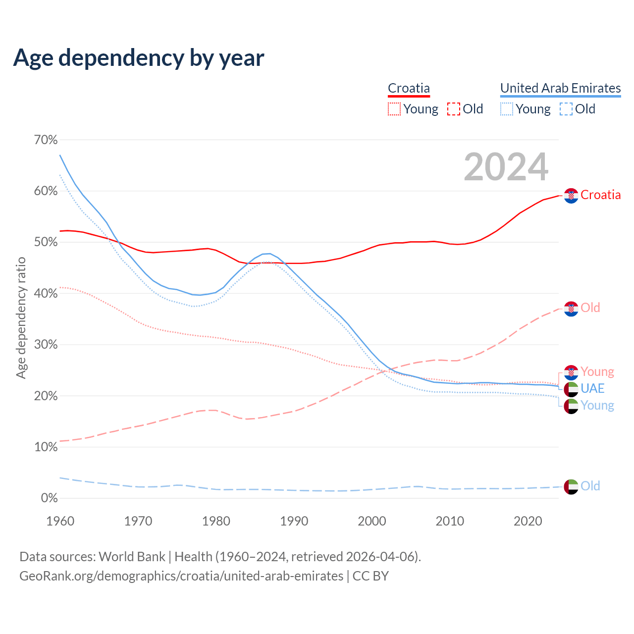 - Croatia is ranked 11/196 by median age (oldest to youngest) vs 91/196 for the United Arab Emirates.
