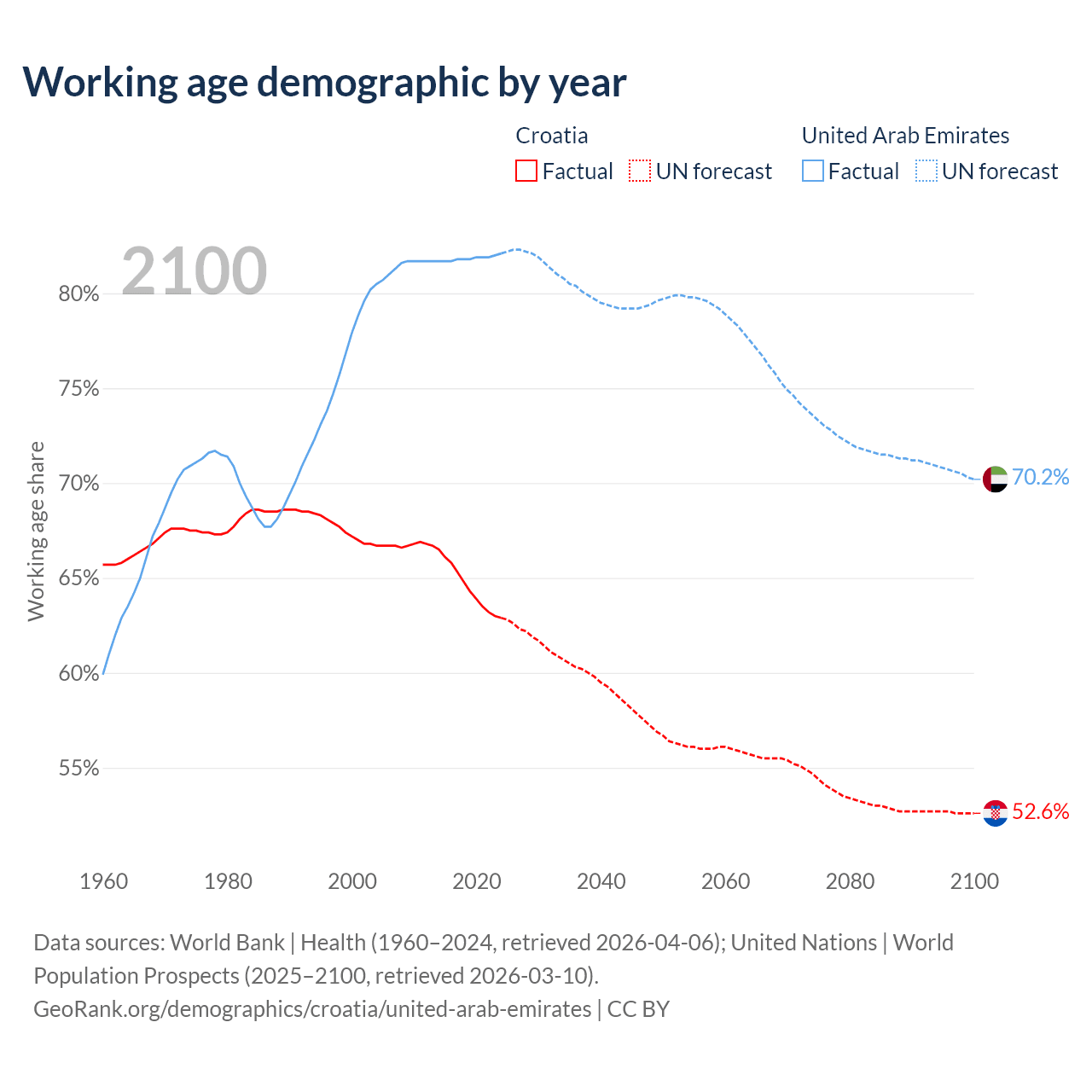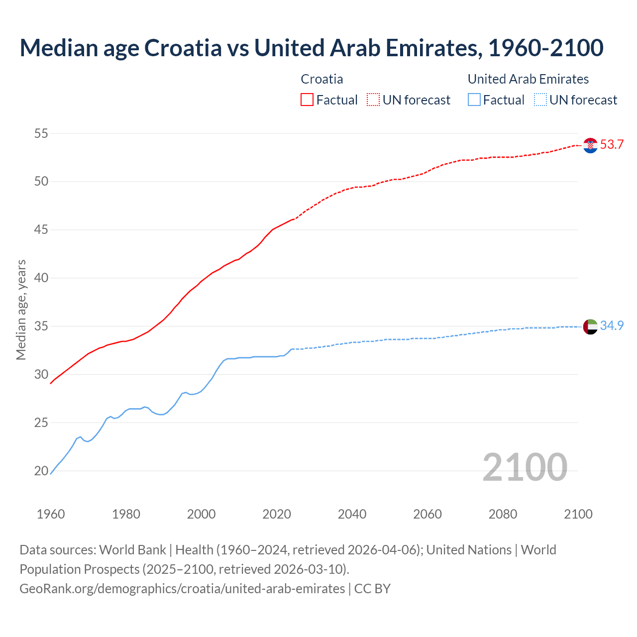 Median age Croatia vs United Arab Emirates, 1960-2100