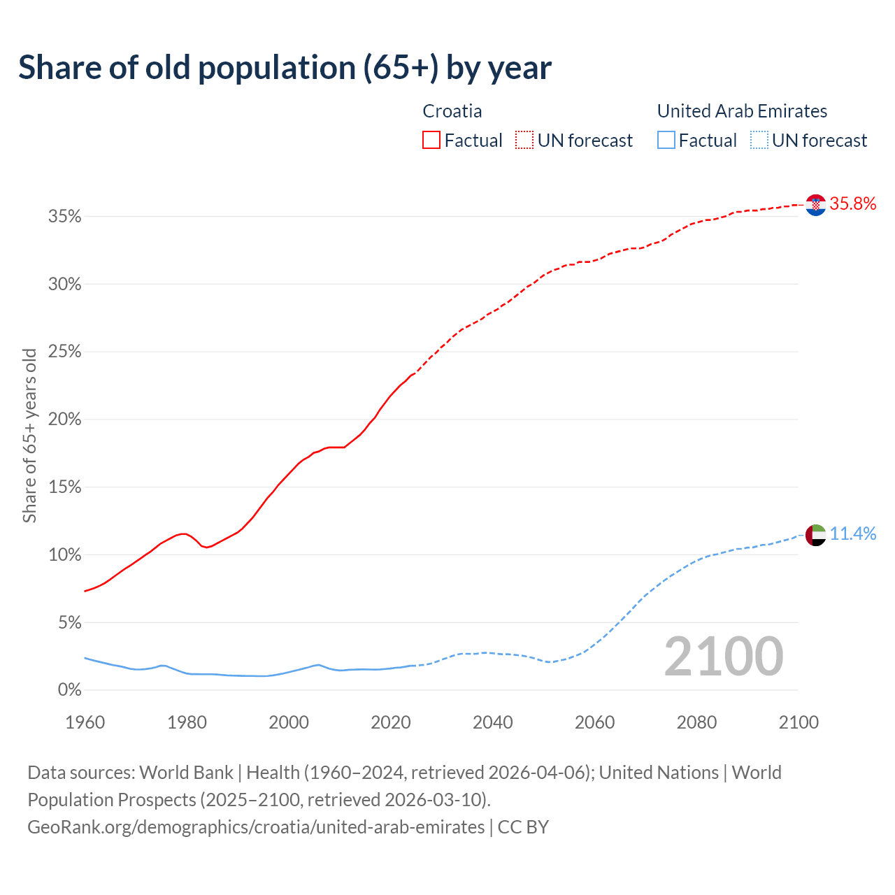 The share of older people aged 65 and over is 23.2% in Croatia and 1.77% in the United Arab Emirates. Life expectancy in Croatia compared to the United Arab Emirates .