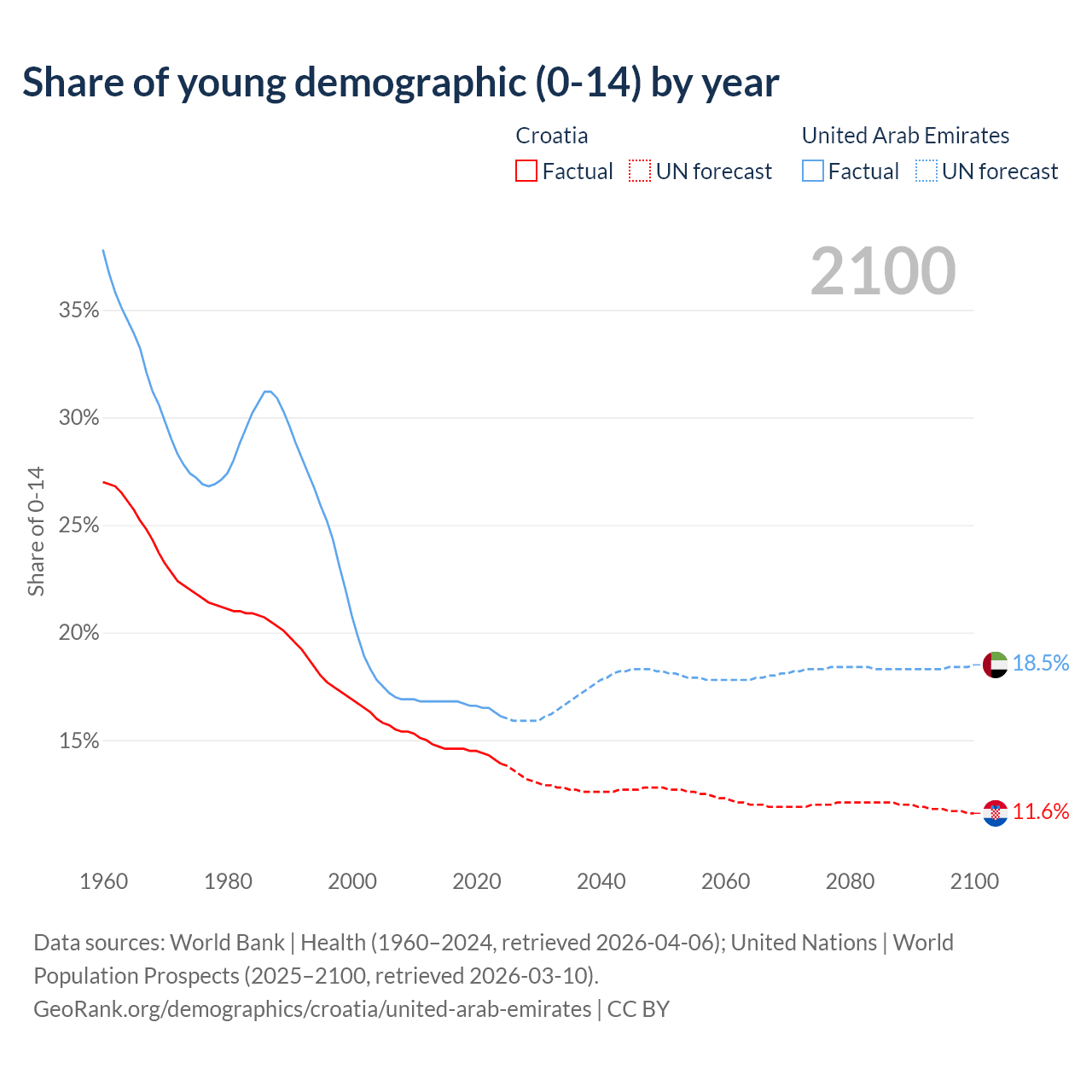 - The share of young demographic (0-15 years old) in Croatia is 13.9% vs 16.1% in the United Arab Emirates.
