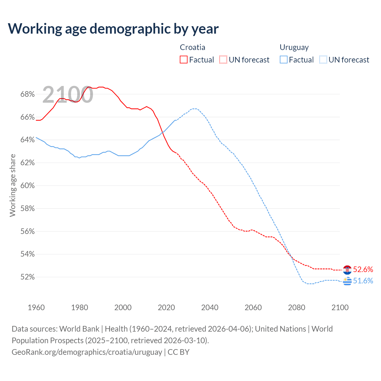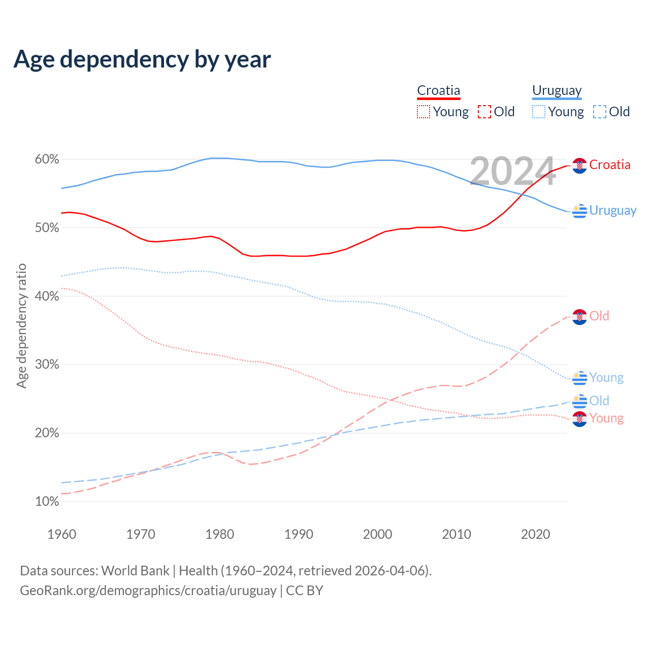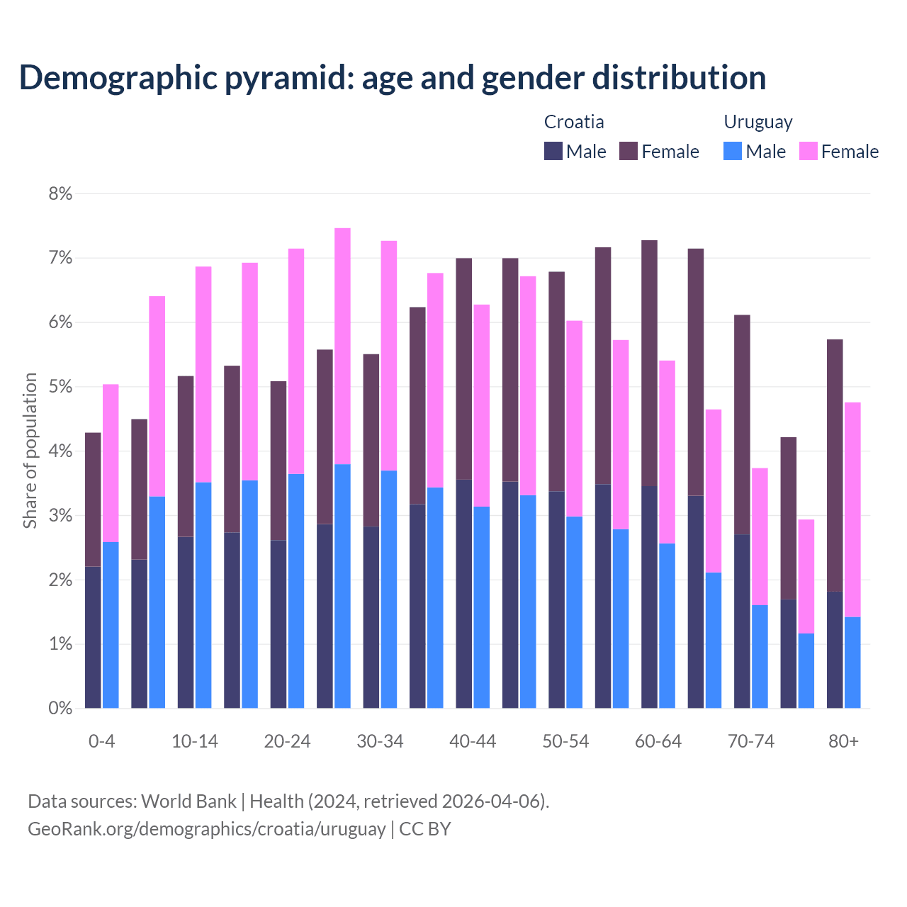 - Croatia is ranked 11/196 by median age (oldest to youngest) vs 63/196 for Uruguay.