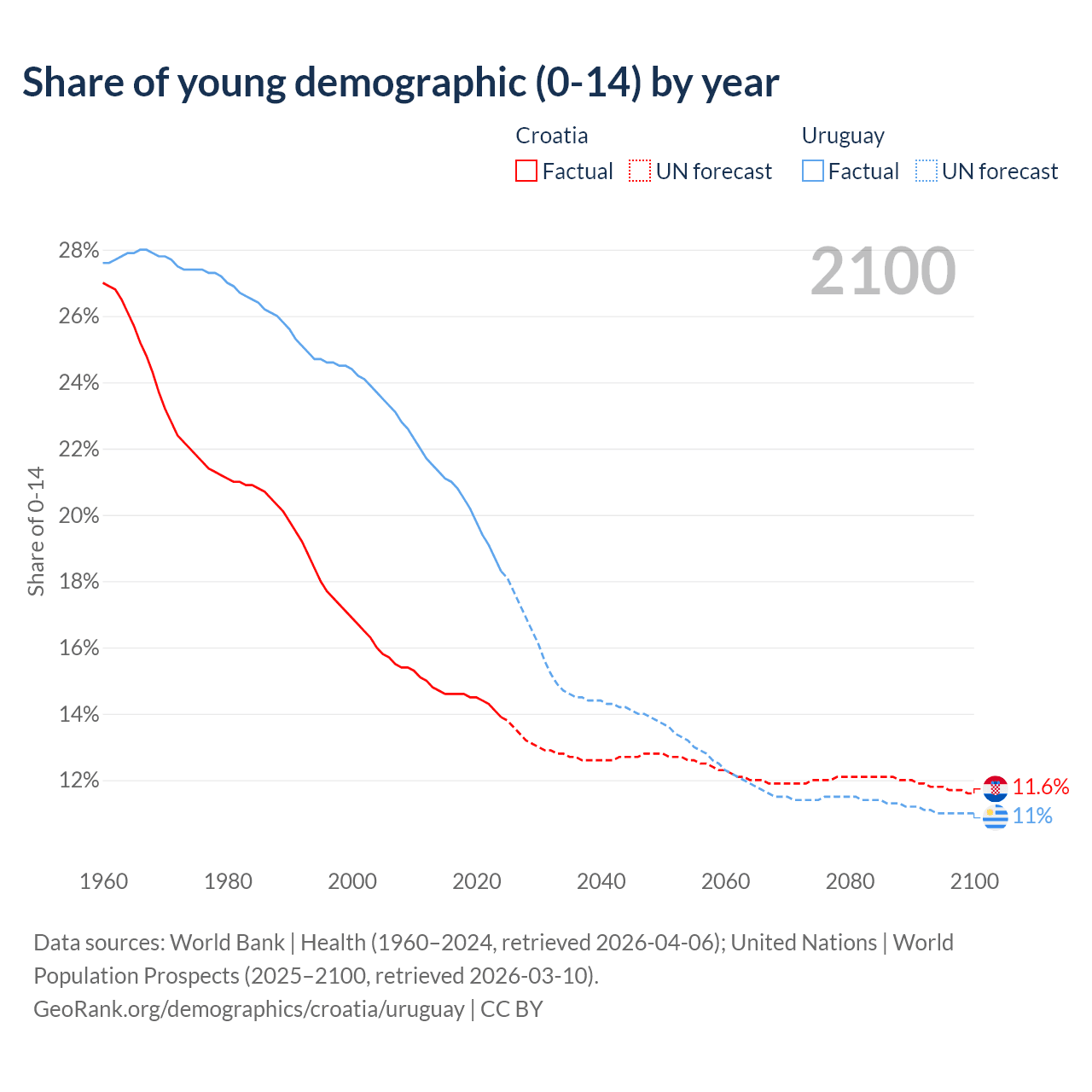 - The share of young demographic (0-15 years old) in Croatia is 13.9% vs 18.3% in Uruguay.