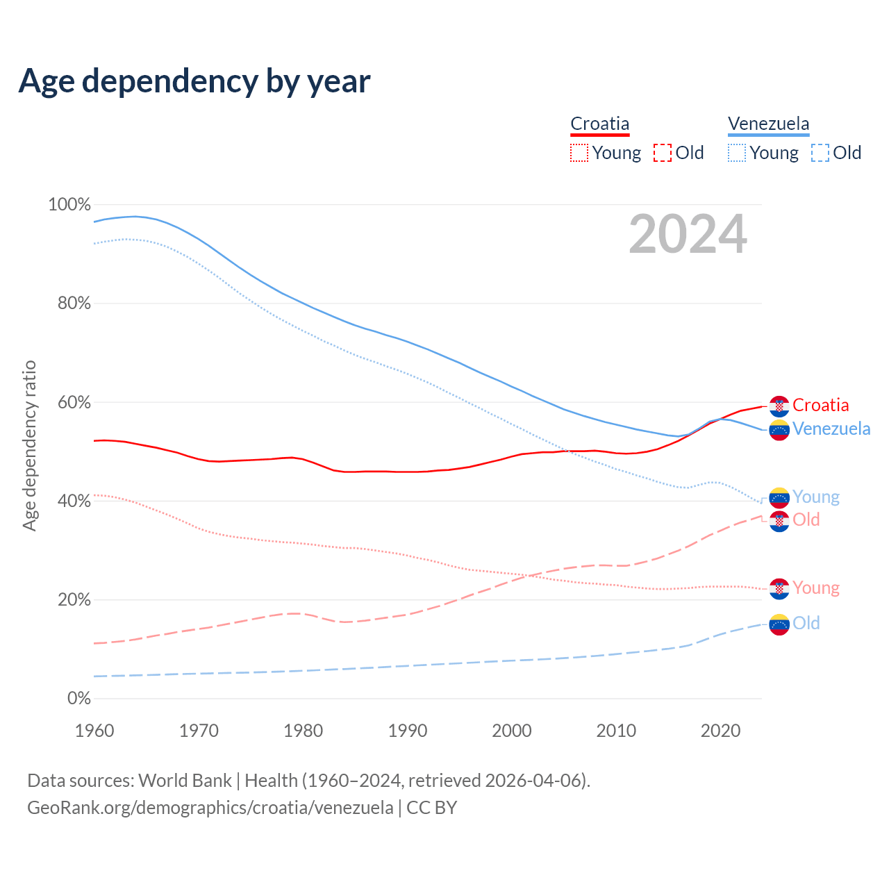 - The share of old-age demographic (65+) in Croatia is 23.2% vs 9.68% in Venezuela.