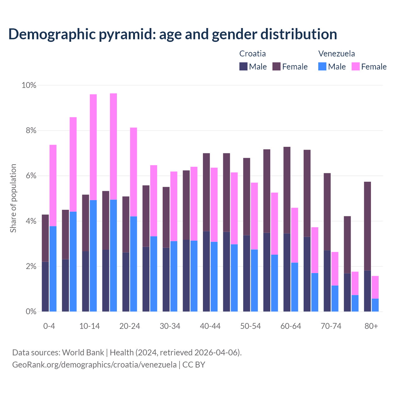 - Croatia is ranked 11/196 by median age (oldest to youngest) vs 104/196 for Venezuela.