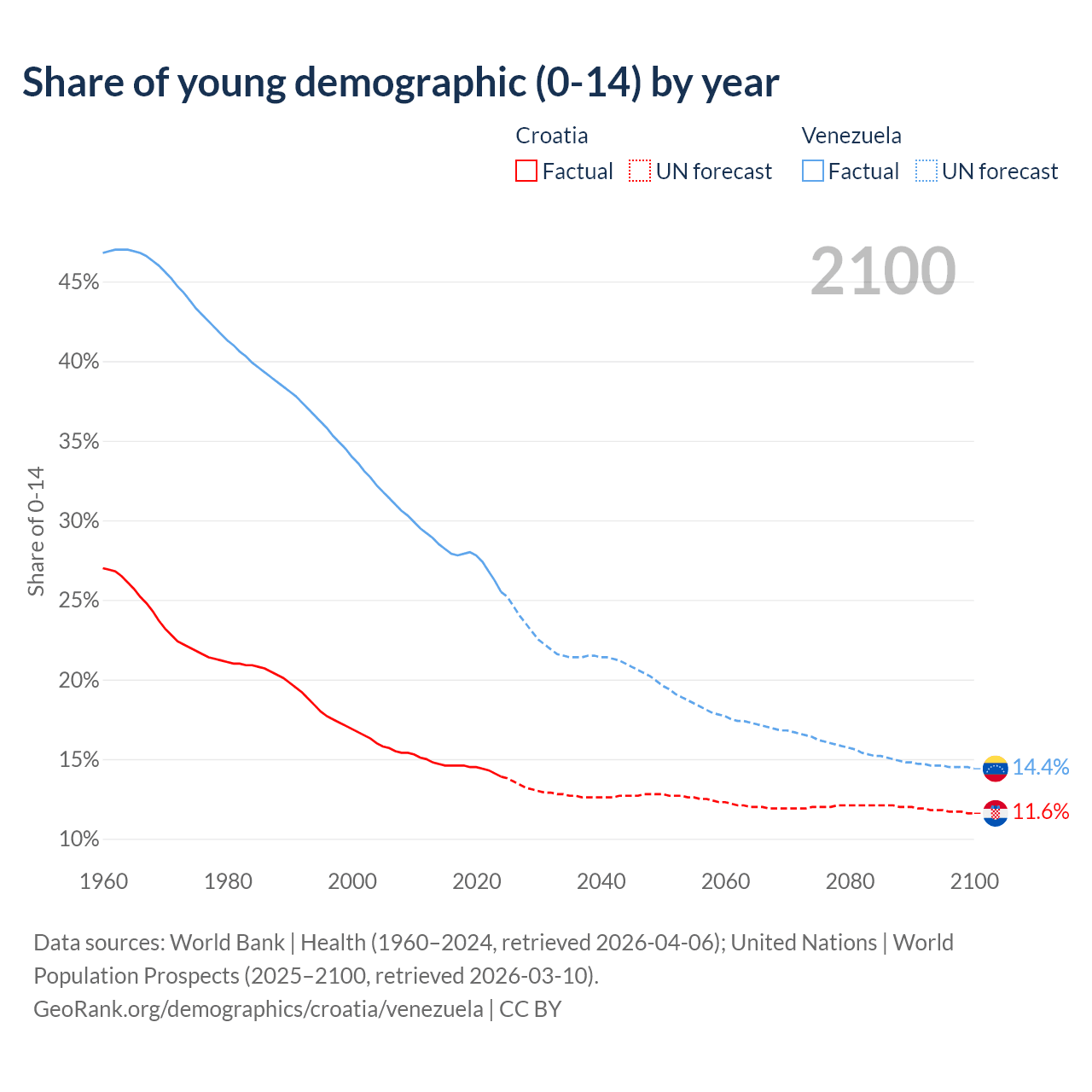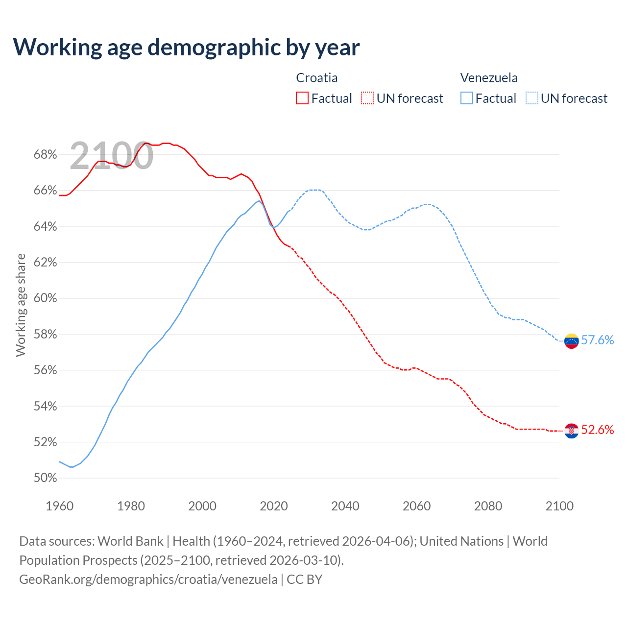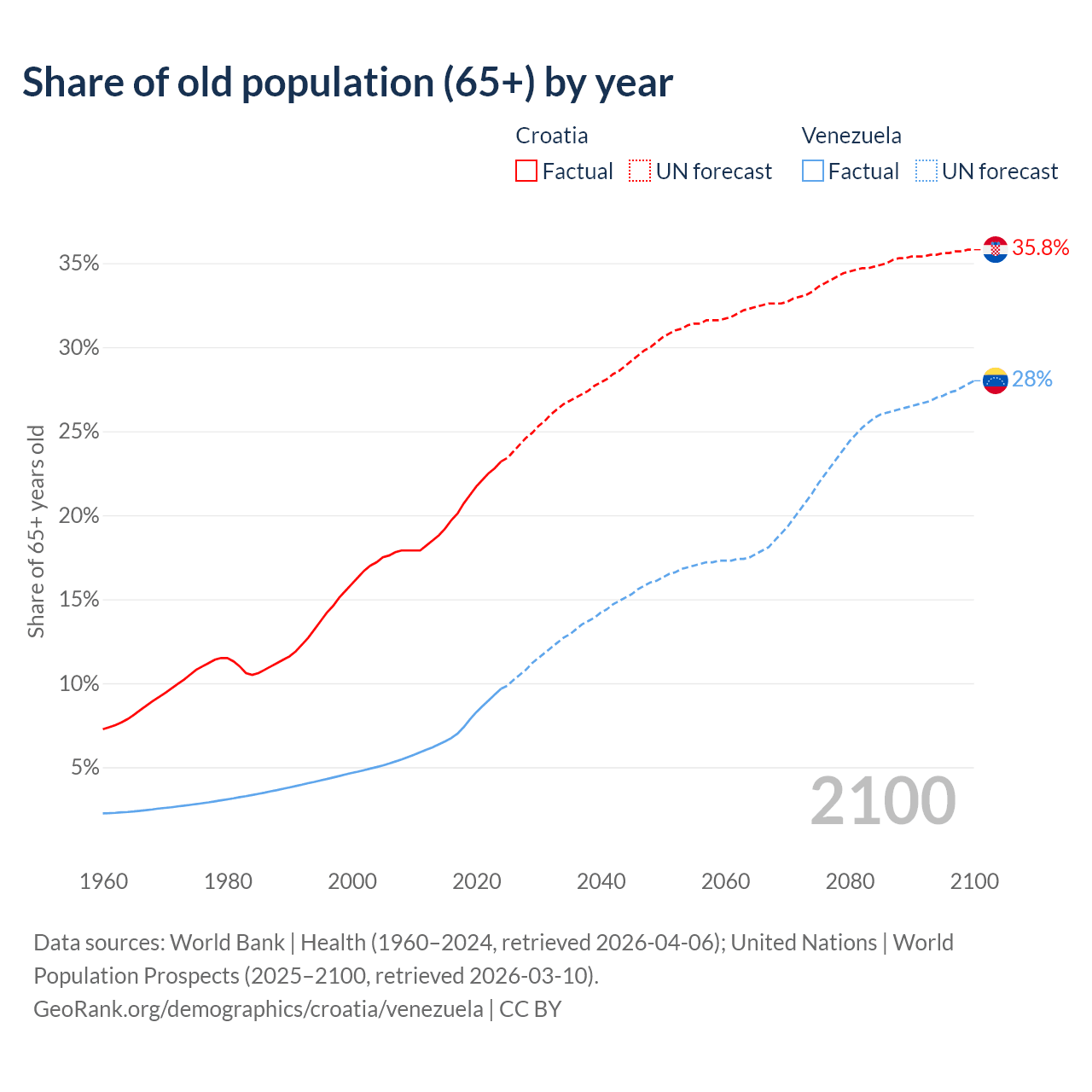Median age Croatia vs Venezuela, 1960-2100