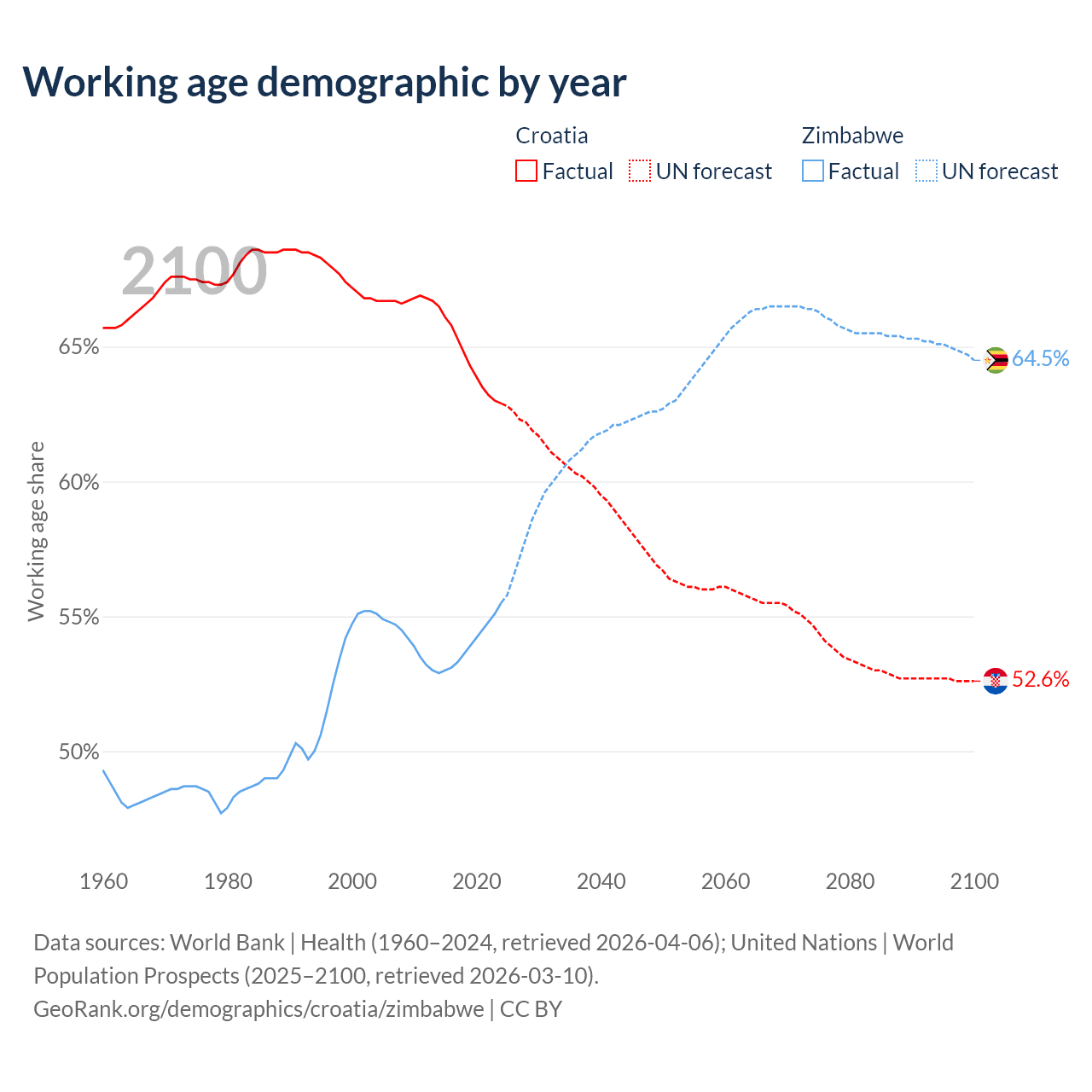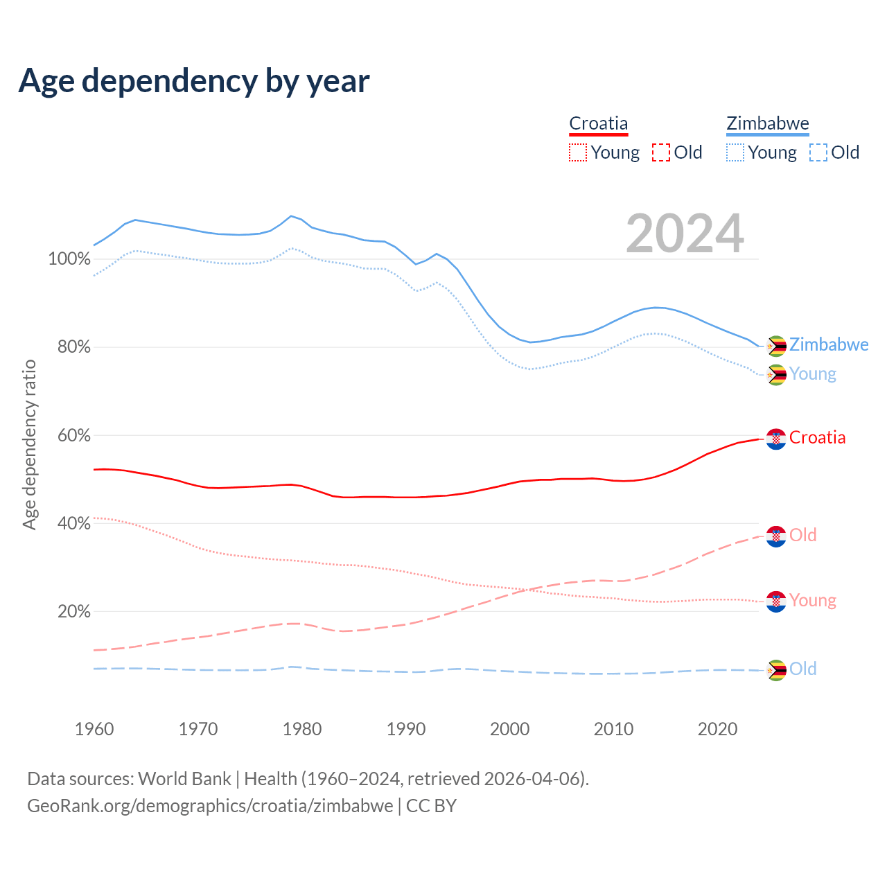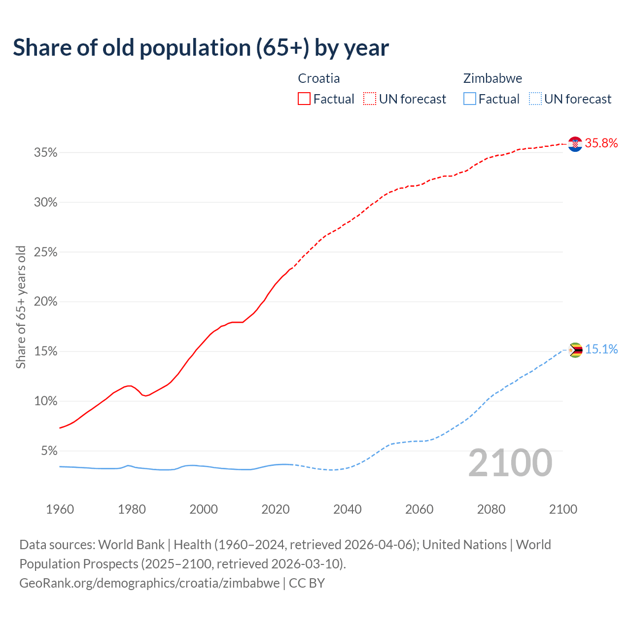 The share of older people aged 65 and over is 23.2% in Croatia and 3.6% in Zimbabwe. Life expectancy in Croatia compared to Zimbabwe .