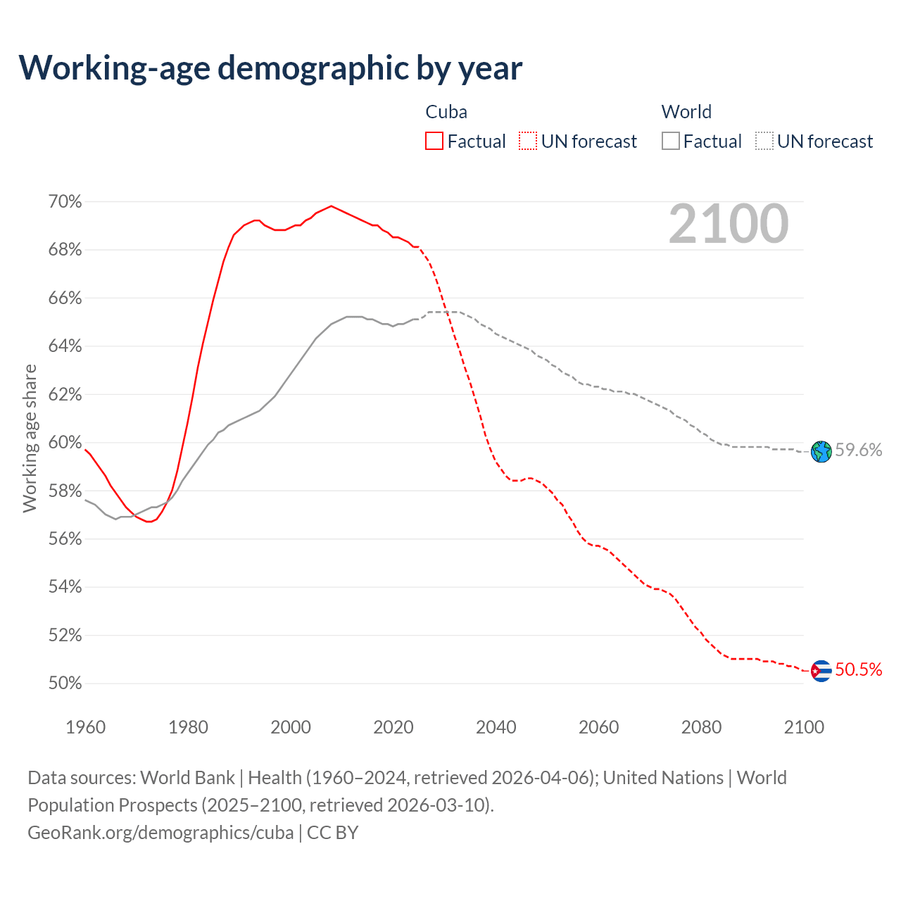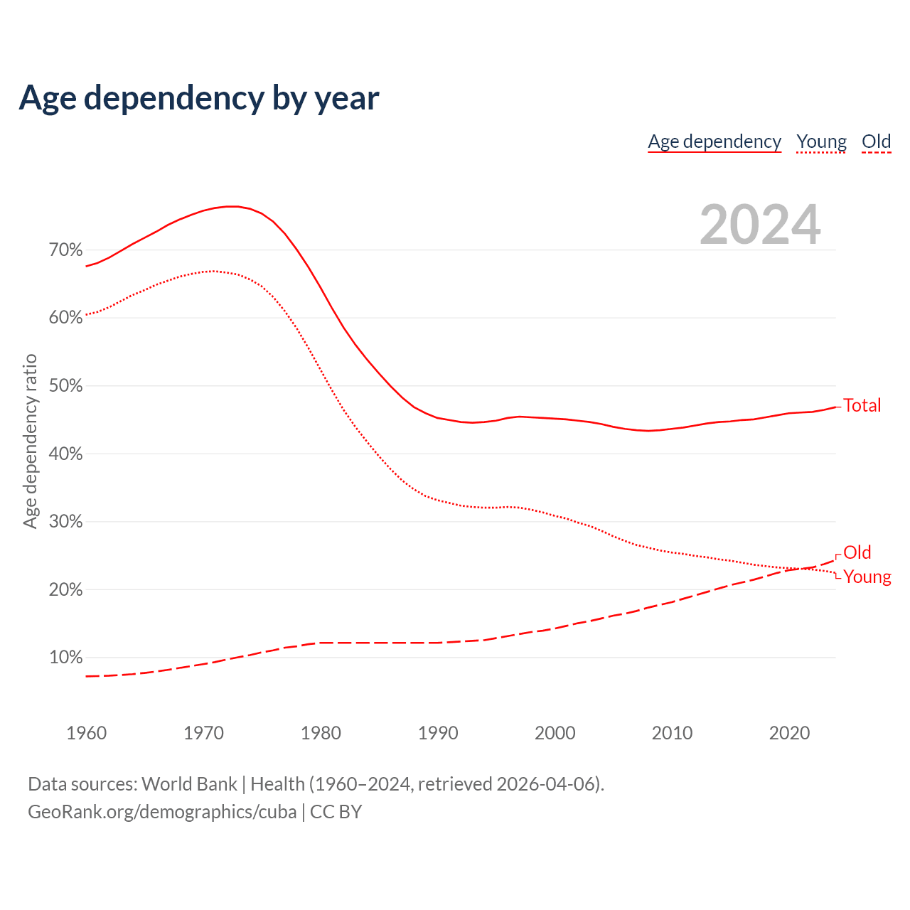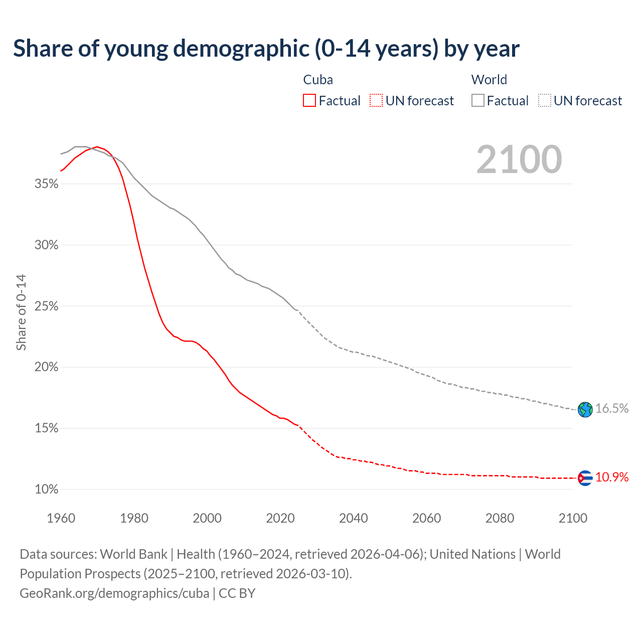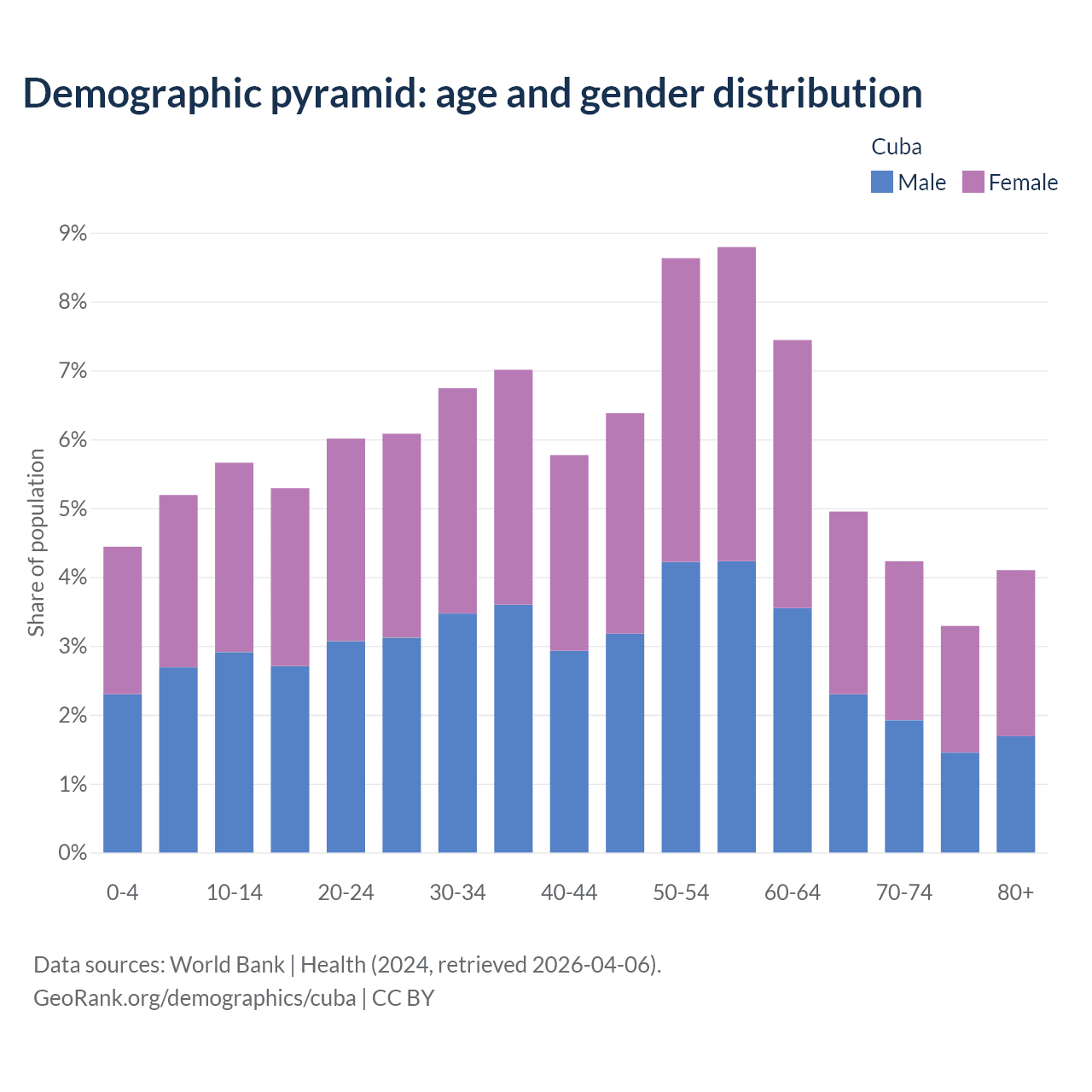 With a population of 11M people, Cuba has a median age of 43.1 years which makes it the 27/196 oldest country. 15.3% of the demographic are children 0-14 years old, 68.1% are working-age people aged 15-64, and 16.6% are older population aged 65+ years.