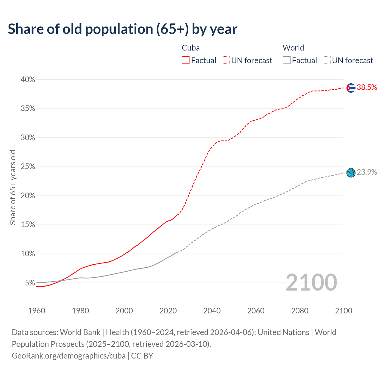 The share of older people aged 65 and over in Cuba increased from 10.9% to 16.6% between 2004 and 2024.