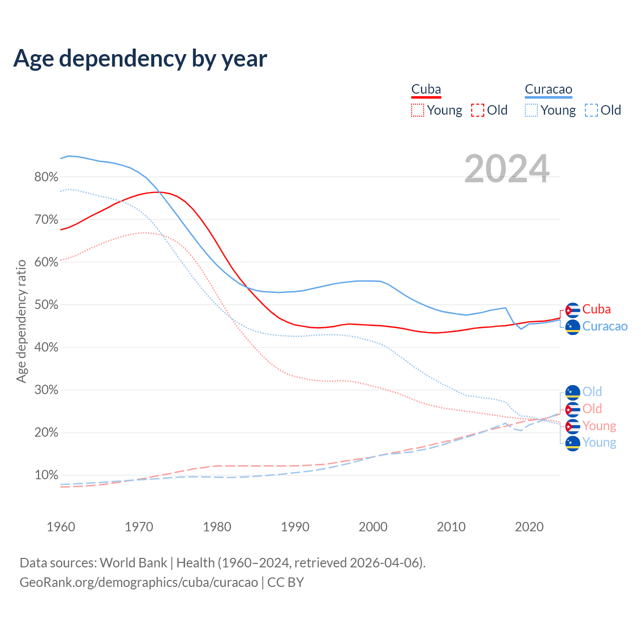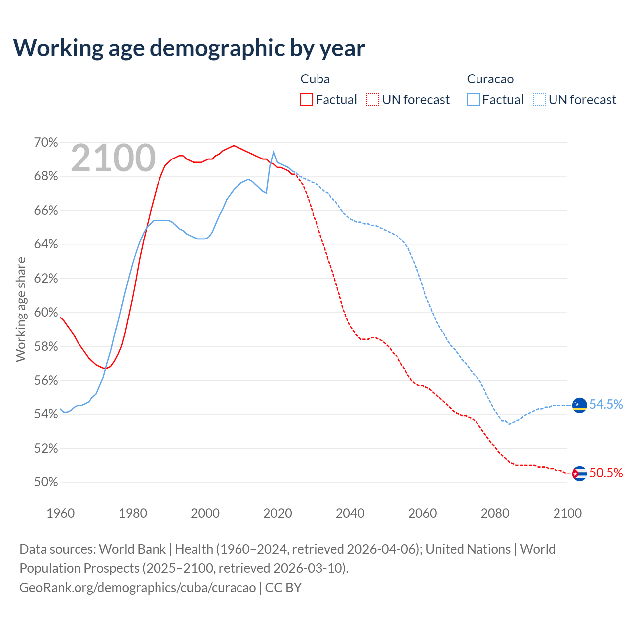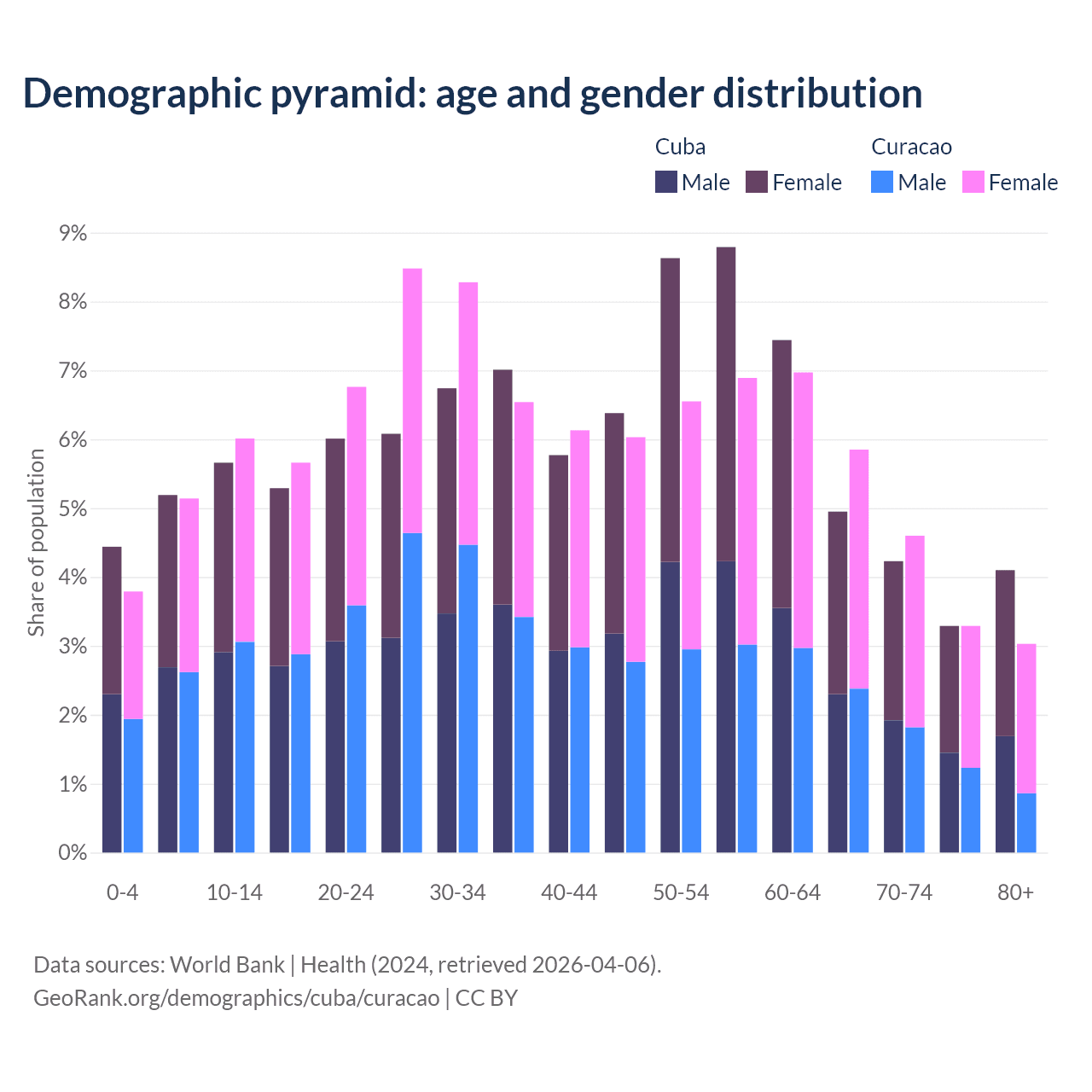 - The share of old-age demographic (65+) in Cuba is 16.6% vs 16.8% in Curacao.