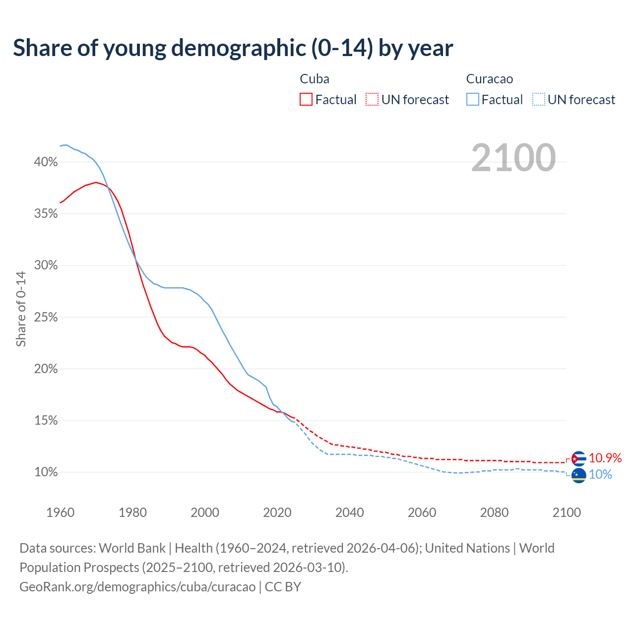 - The share of young demographic (0-15 years old) in Cuba is 15.3% vs 14.9% in Curacao.