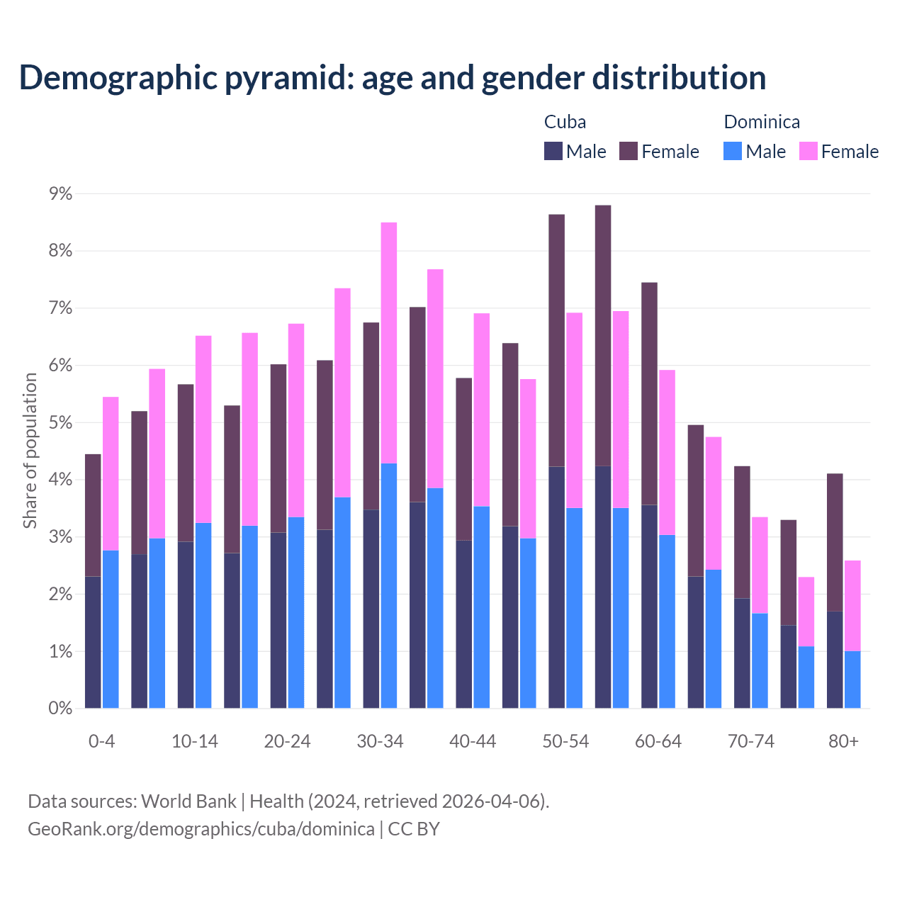 - Cuba is ranked 27/196 by median age (oldest to youngest) vs 66/196 for Dominica.