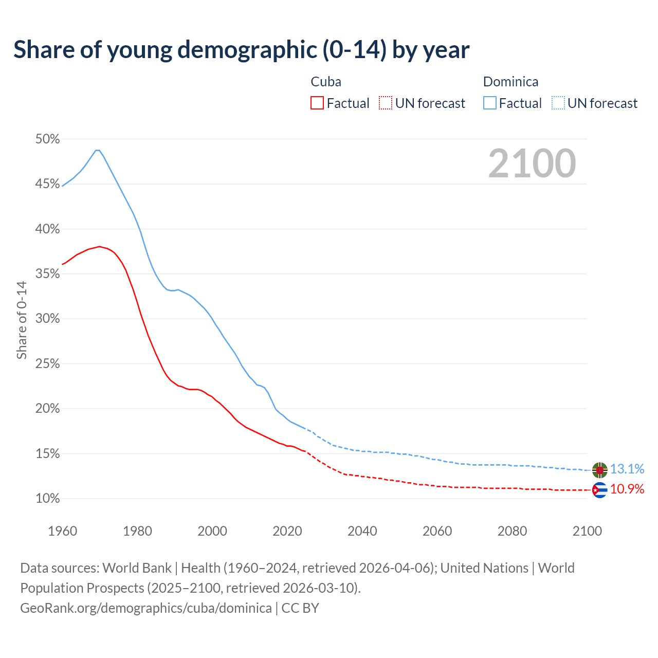 - The share of young demographic (0-15 years old) in Cuba is 15.3% vs 17.9% in Dominica.