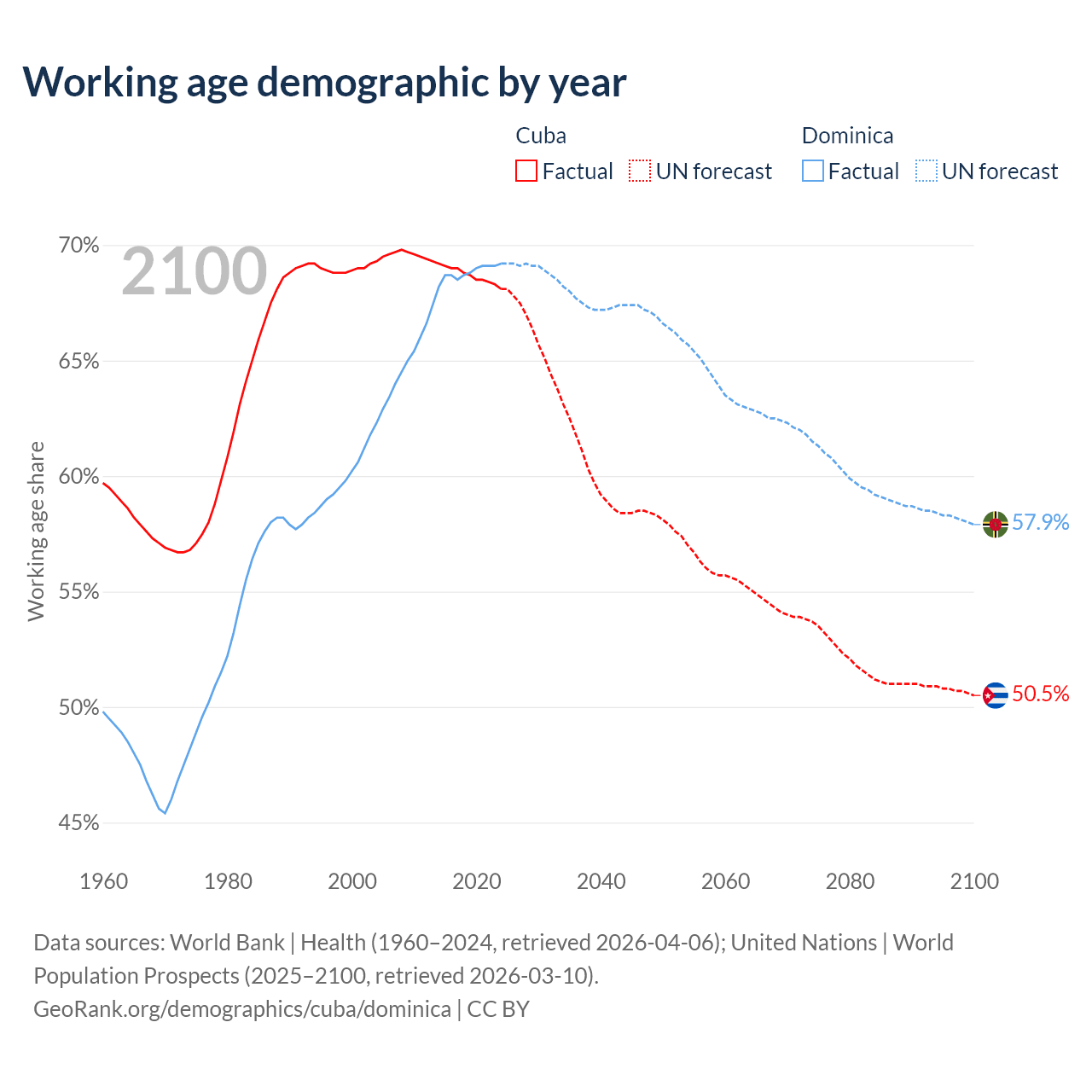 - Cuba has 7.42M working age adults (aged 15-64) vs 45.3K in Dominica.