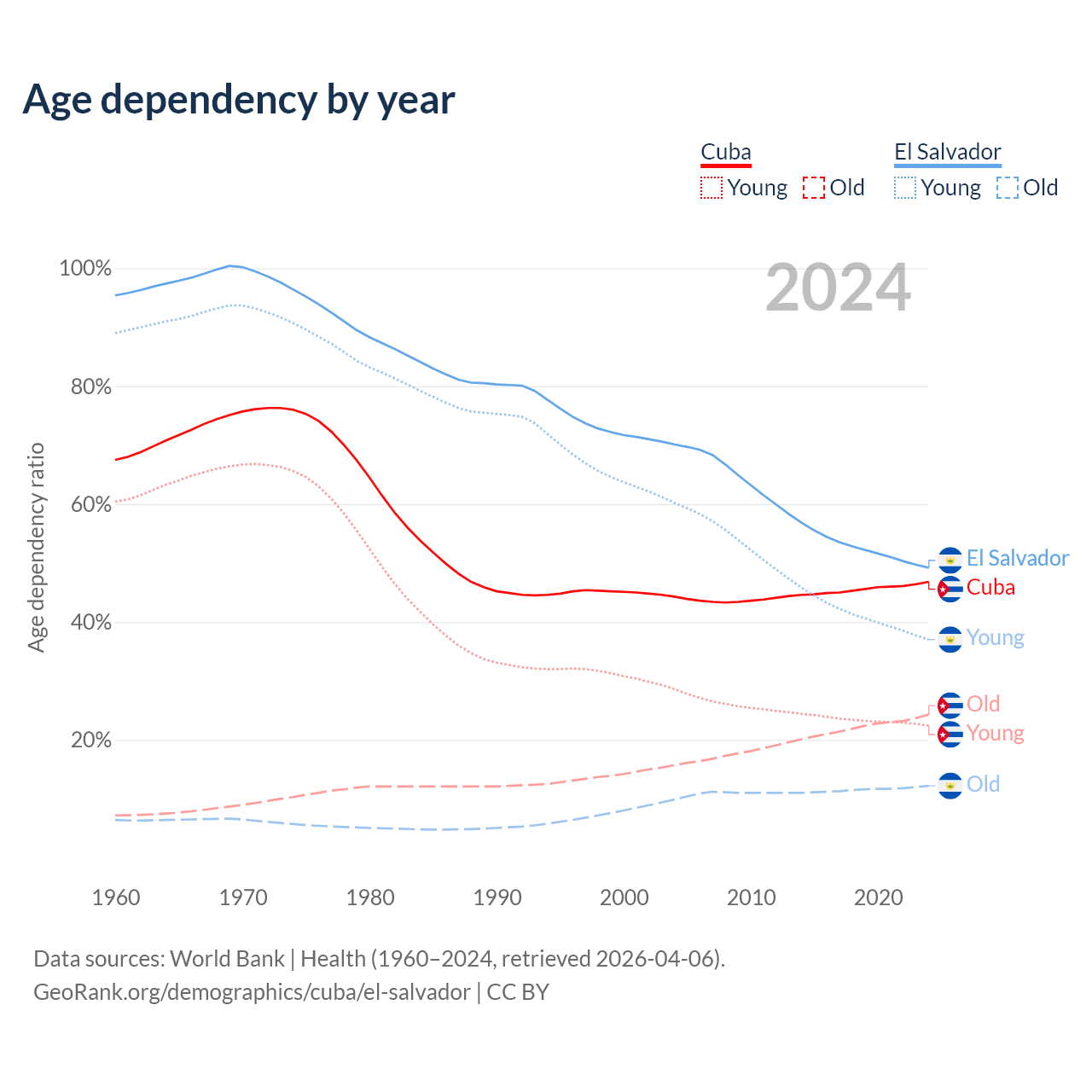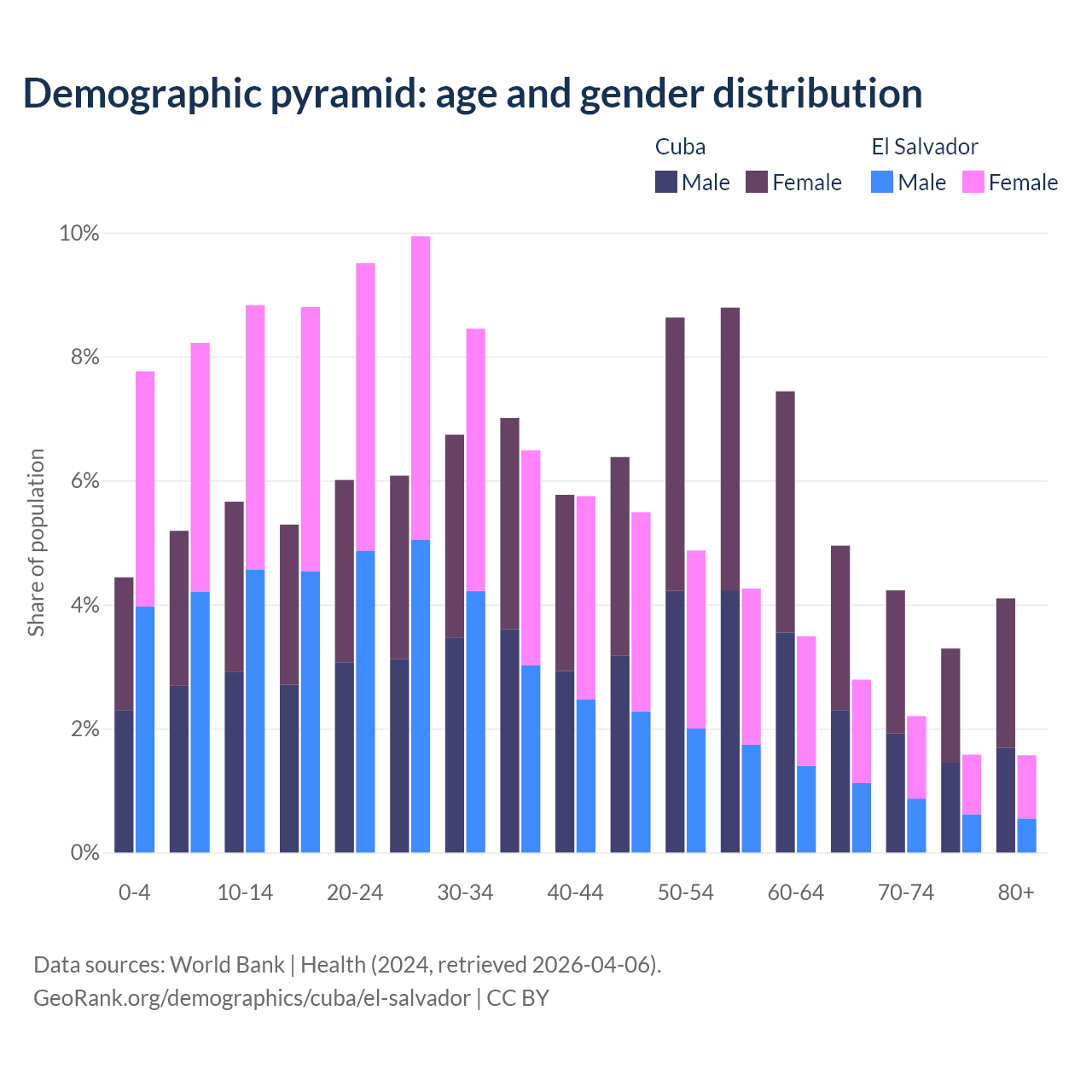 - Cuba is ranked 27/196 by median age (oldest to youngest) vs 115/196 for El Salvador.