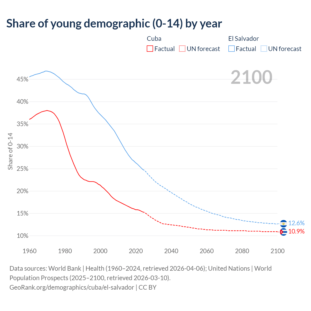 - The share of young demographic (0-15 years old) in Cuba is 15.3% vs 24.8% in El Salvador.
