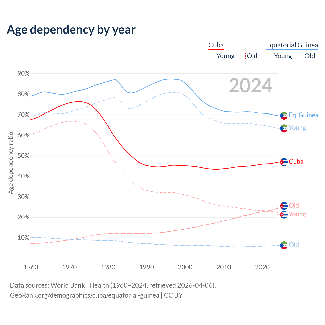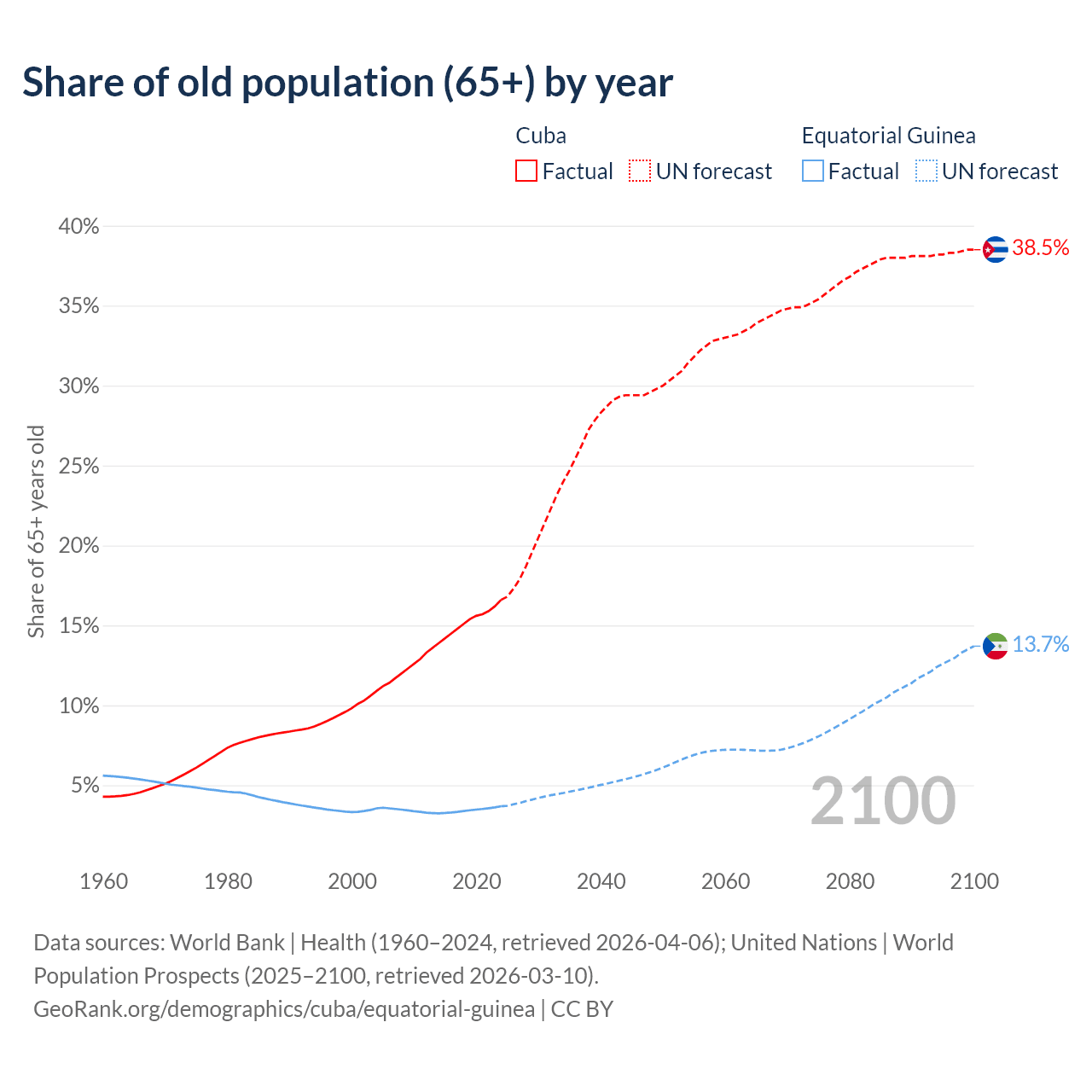 - The share of old-age demographic (65+) in Cuba is 16.6% vs 3.69% in Equatorial Guinea.