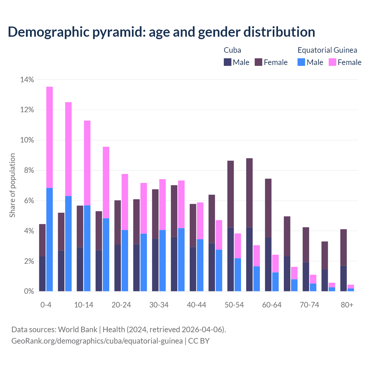 - Cuba is ranked 27/196 by median age (oldest to youngest) vs 148/196 for Equatorial Guinea.