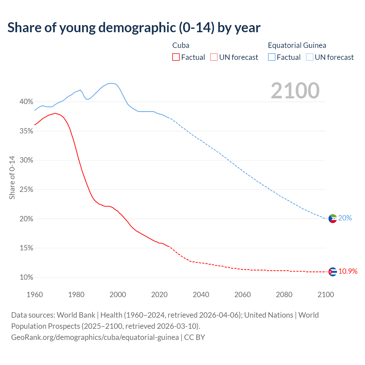 - The share of young demographic (0-15 years old) in Cuba is 15.3% vs 37.3% in Equatorial Guinea.