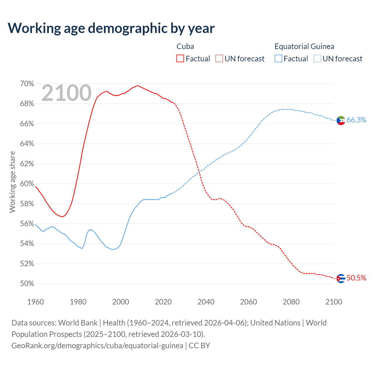 - Cuba has 7.42M working age adults (aged 15-64) vs 1.18M in Equatorial Guinea.