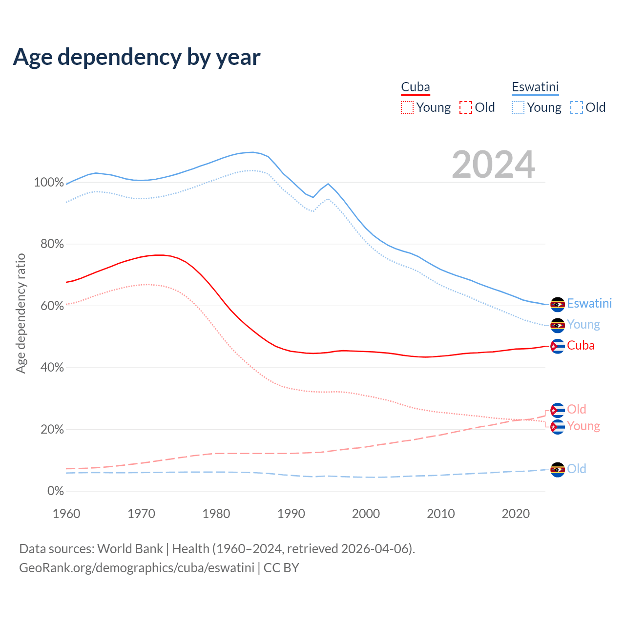 - The share of old-age demographic (65+) in Cuba is 16.6% vs 4.26% in Eswatini.