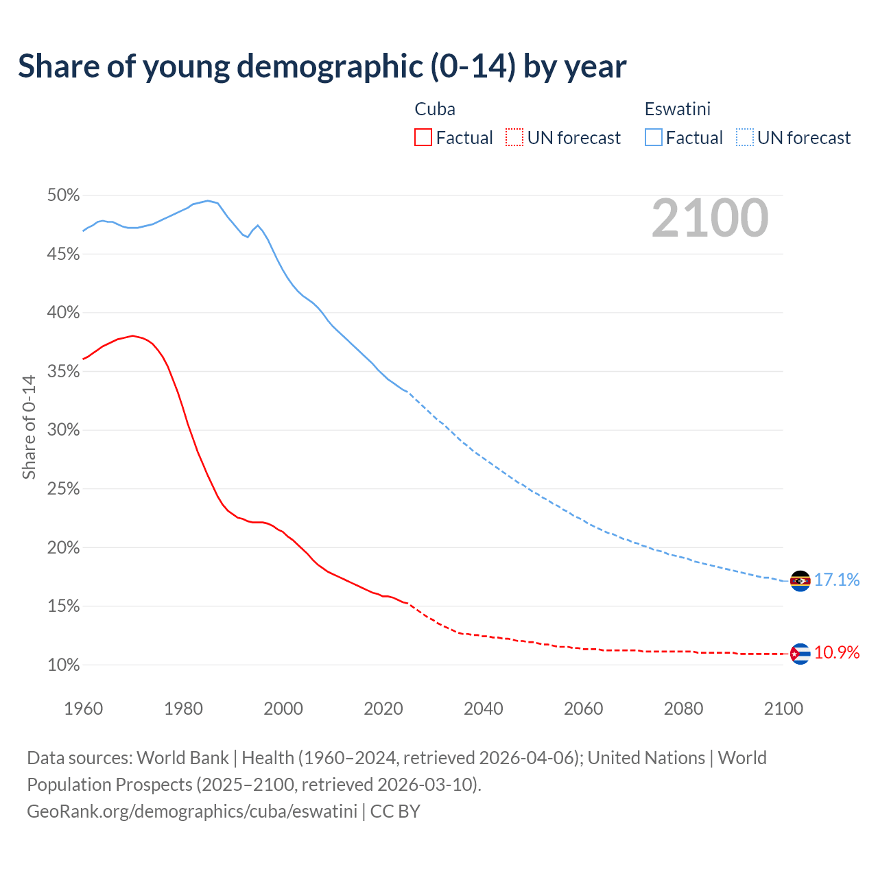 - The share of young demographic (0-15 years old) in Cuba is 15.3% vs 33.4% in Eswatini.