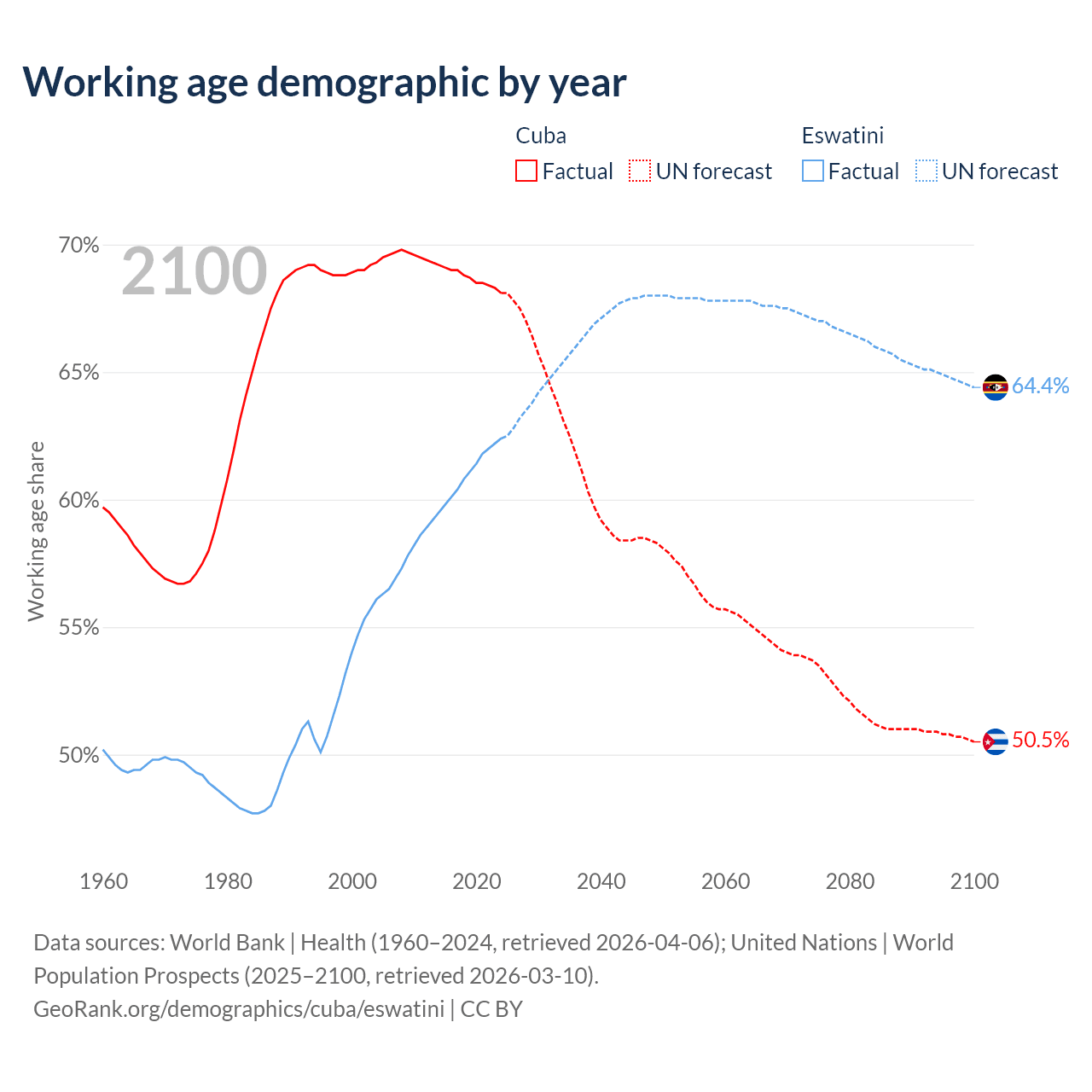 Median age Cuba vs Eswatini, 1960-2100