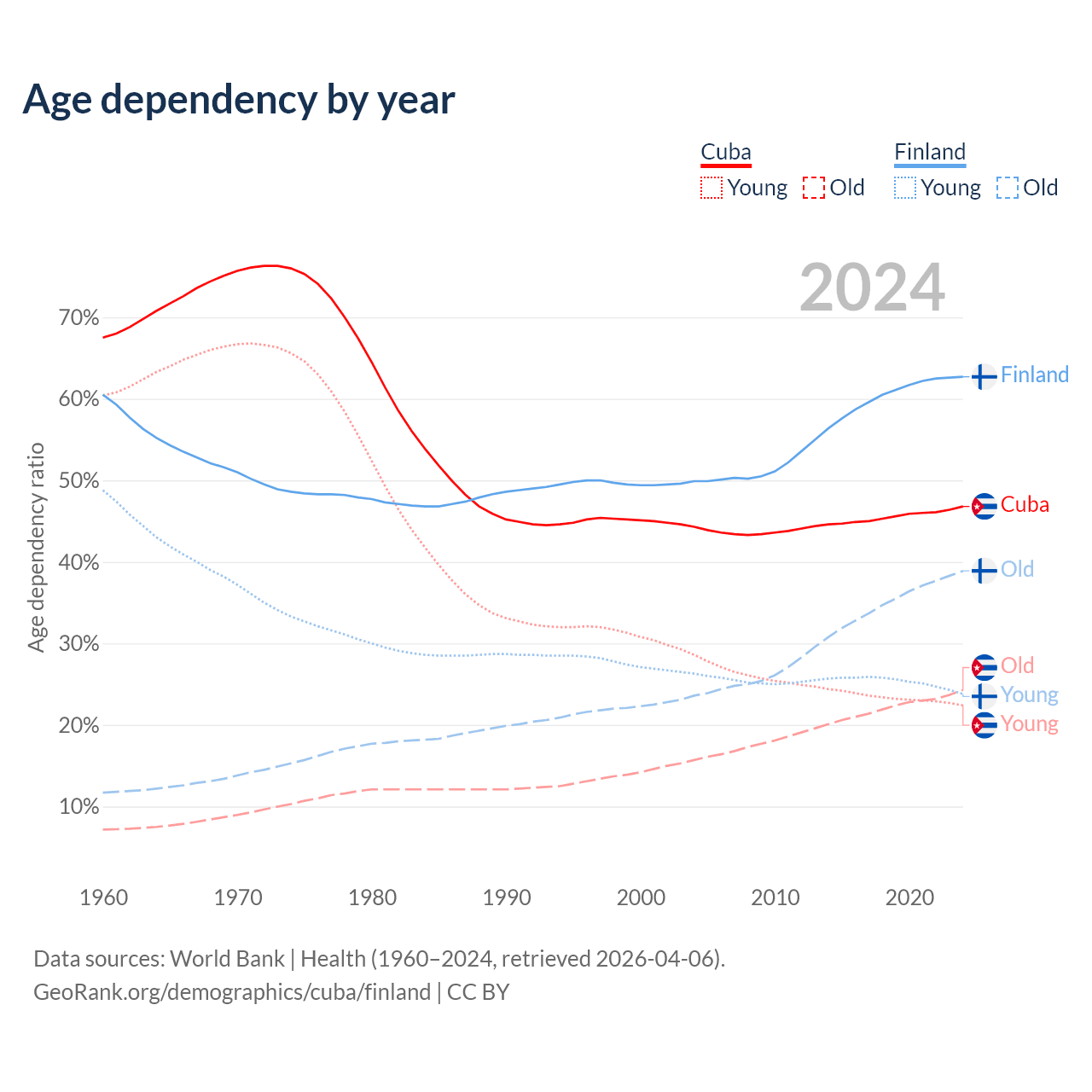 The share of older people aged 65 and over is 16.6% in Cuba and 23.9% in Finland. Life expectancy in Cuba compared to Finland .
