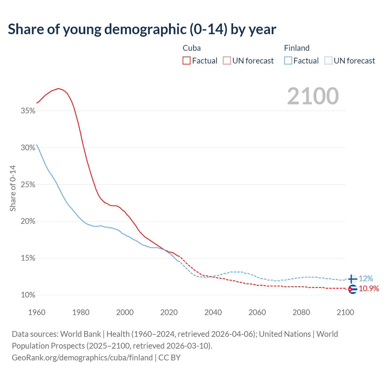 - The share of young demographic (0-15 years old) in Cuba is 15.3% vs 14.6% in Finland.