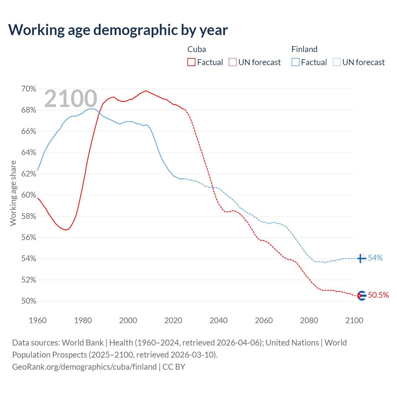 Median age Cuba vs Finland, 1960-2100