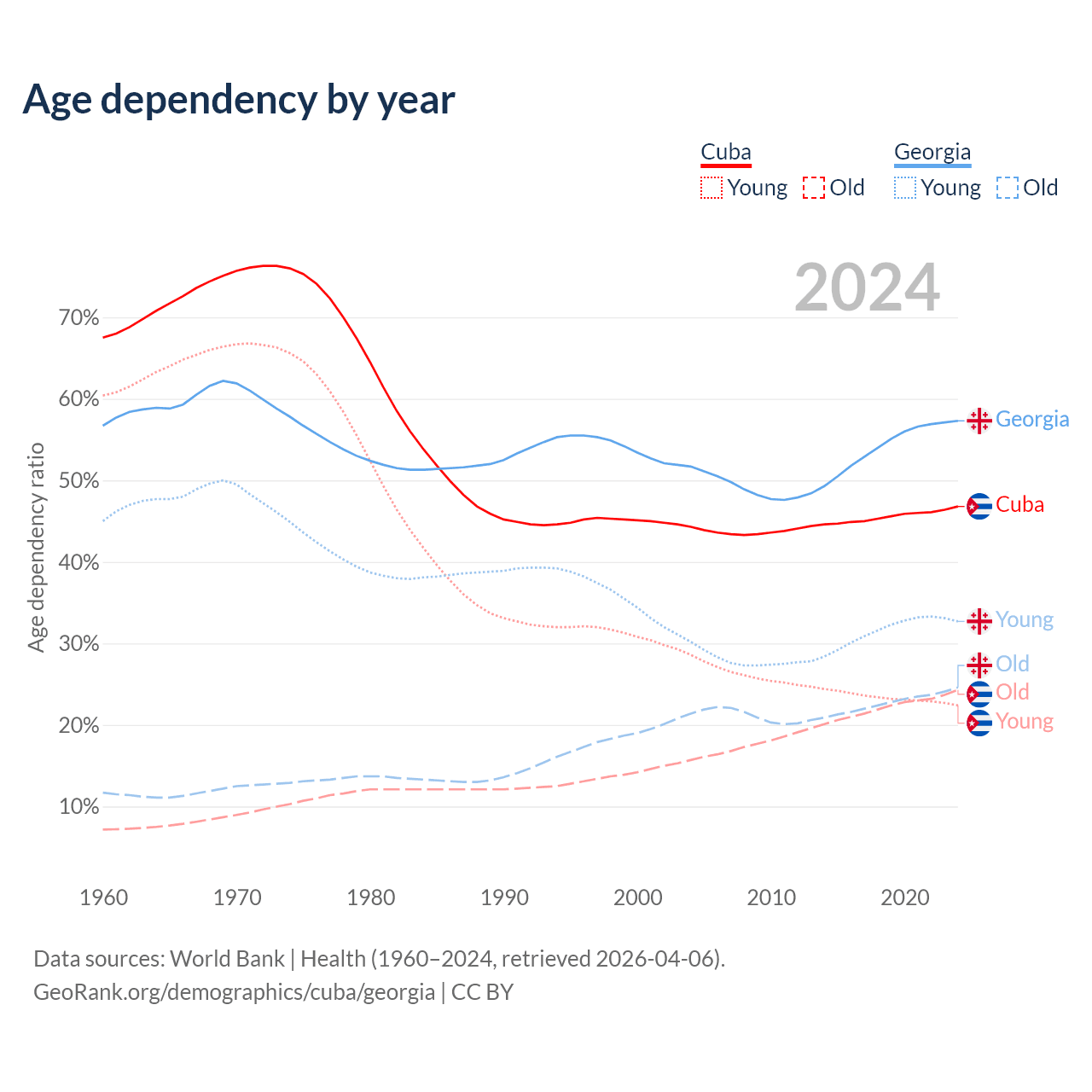 - Cuba is ranked 27/196 by median age (oldest to youngest) vs 59/196 for Georgia.