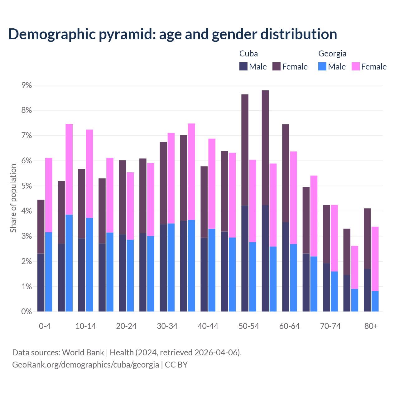 - The share of old-age demographic (65+) in Cuba is 16.6% vs 15.6% in Georgia.
