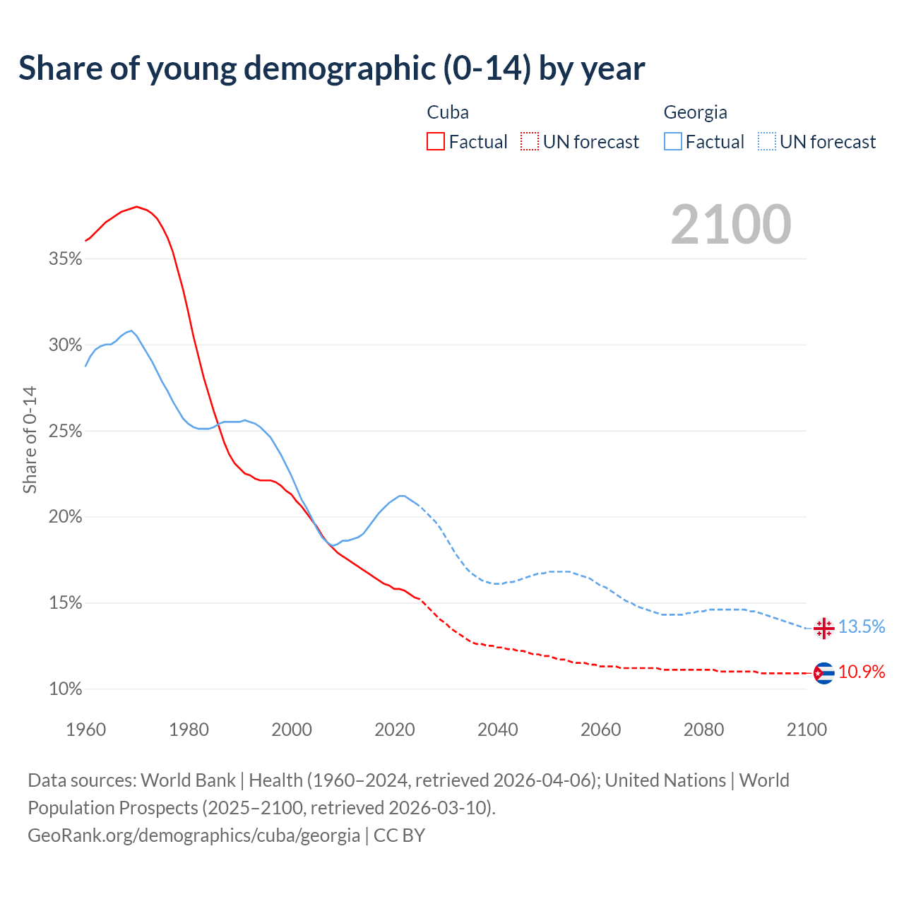 - The share of young demographic (0-15 years old) in Cuba is 15.3% vs 20.8% in Georgia.