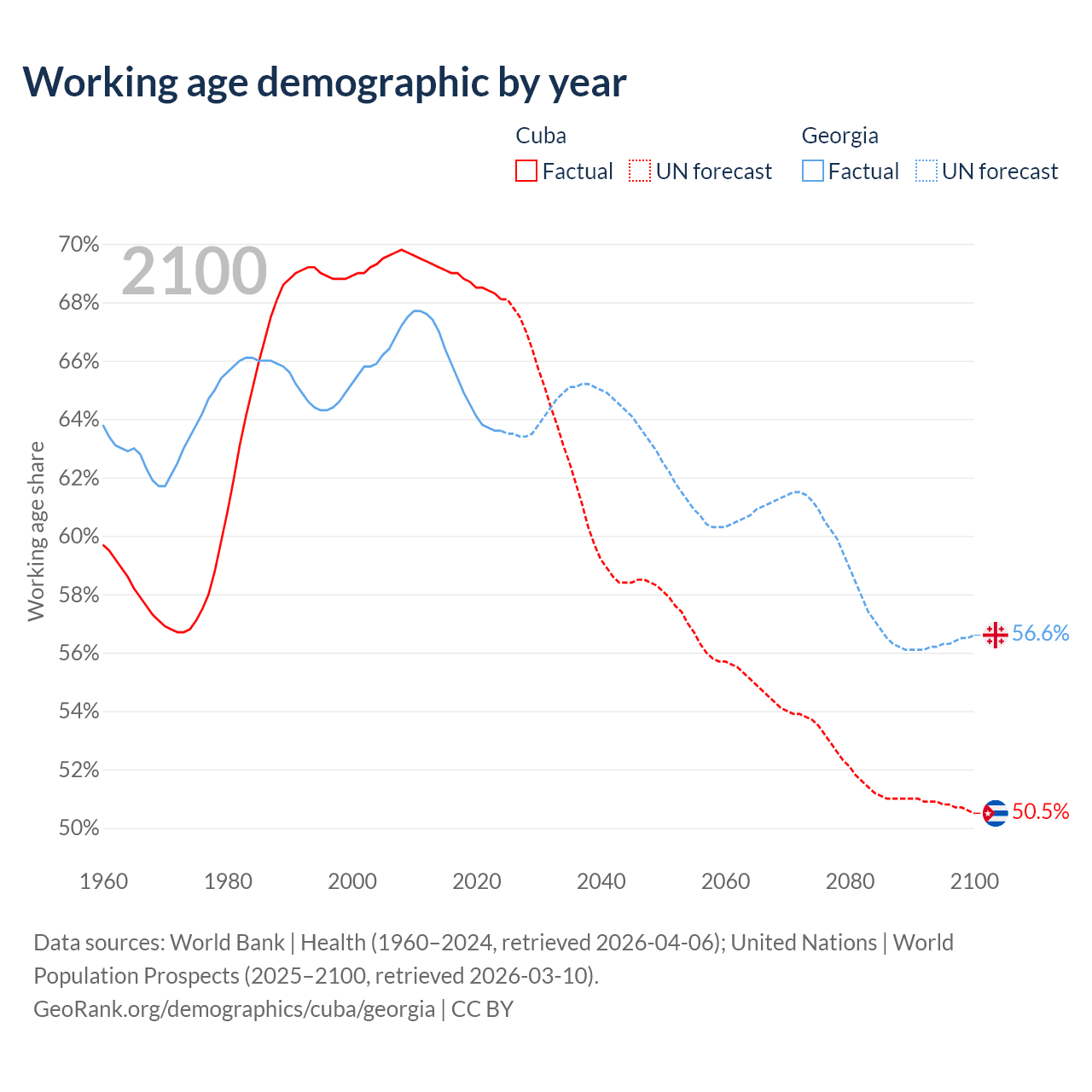 Median age Cuba vs Georgia, 1960-2100