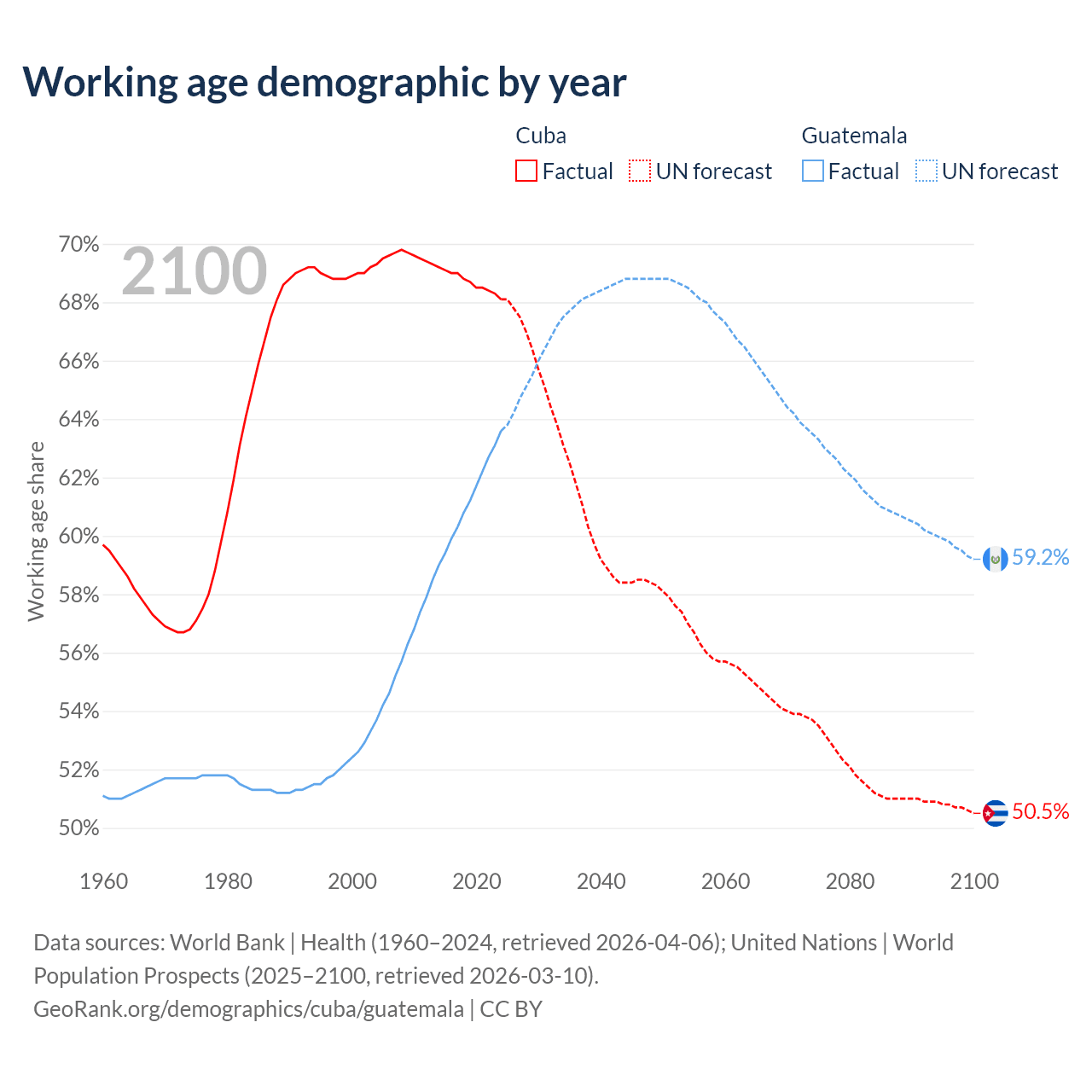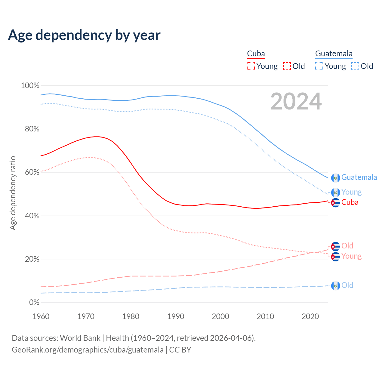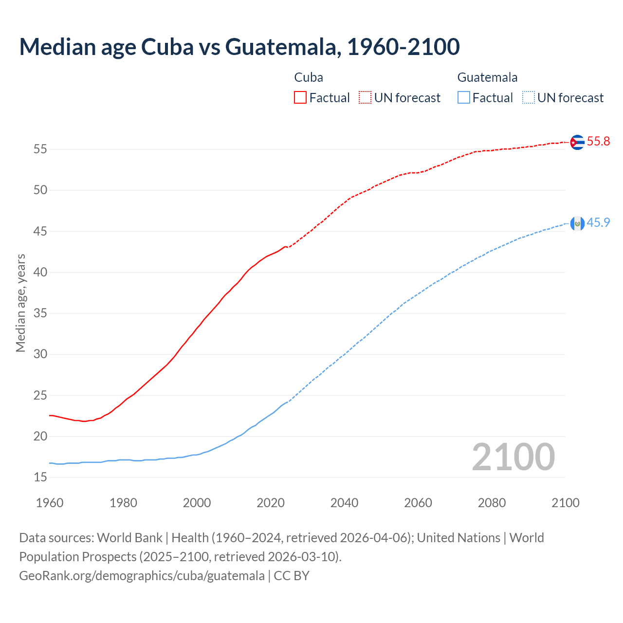 - Cuba is ranked 27/196 by median age (oldest to youngest) vs 137/196 for Guatemala.