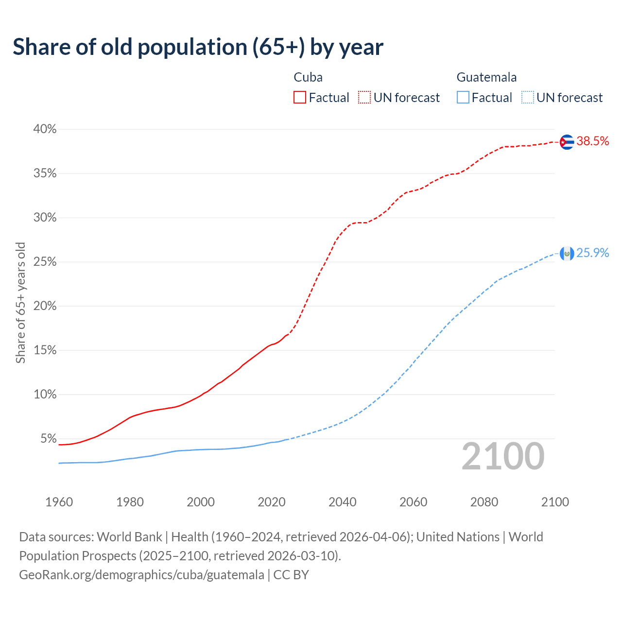 - The share of old-age demographic (65+) in Cuba is 16.6% vs 4.85% in Guatemala.
