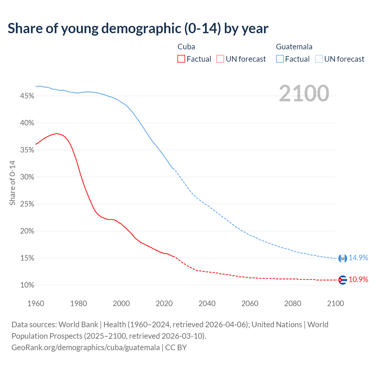 - The share of young demographic (0-15 years old) in Cuba is 15.3% vs 31.6% in Guatemala.